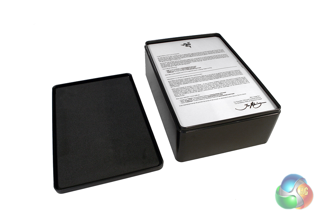 Not content to contain the Mamba in one box, Razer opted for two. Within its cardboard container is a secondary aluminium box, with a removable, padded lid. Inside is a plastic sheet with a pat on the back to you, the buyer, for having such good taste.