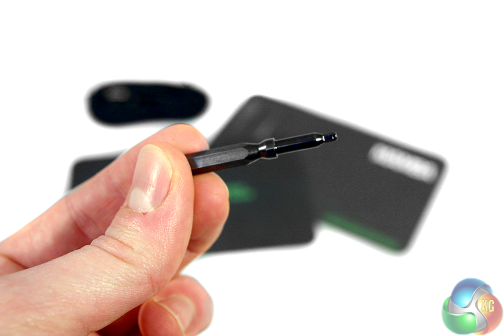 Along with the mouse itself, there is a manual, a quick-start guide sheet, a micro-USB cable with a unique header for attaching the mouse in wired mode, and powering the accompanying dock, along with a unique hex-head screwdriver.