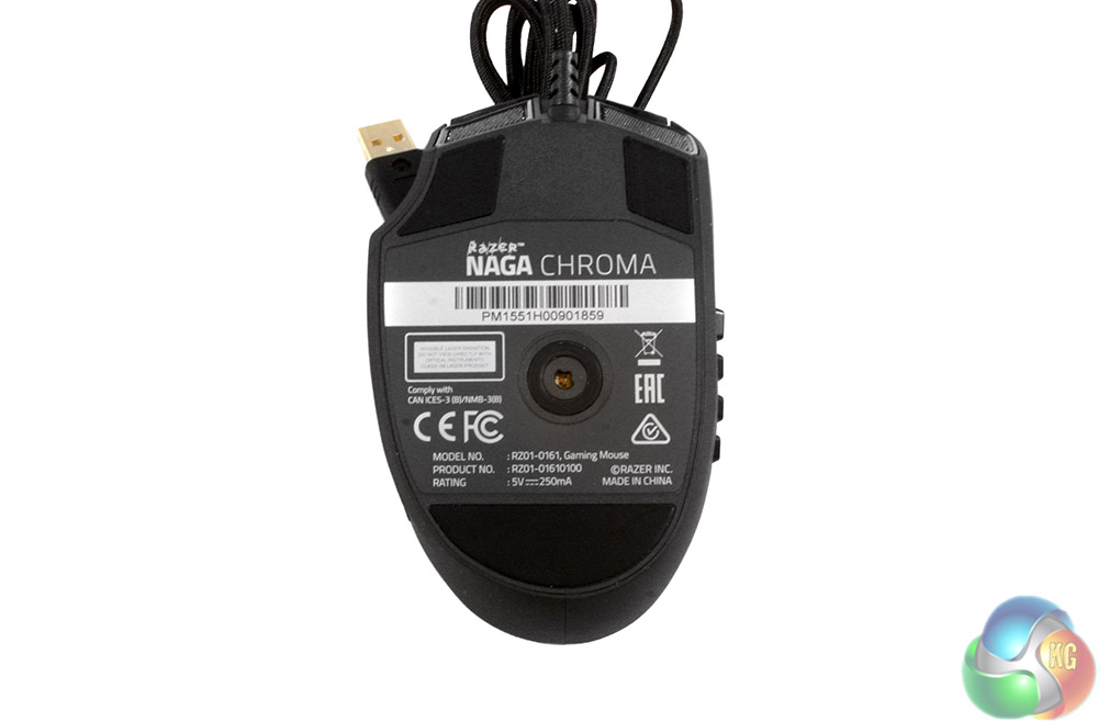 On the underside of the Razer Naga Chroma, we have a centrally located 5G laser sensor and a trio of PTFE feet. At the front end is a notable protector at the base of the cable, which should help prevent shearing over long-term use.