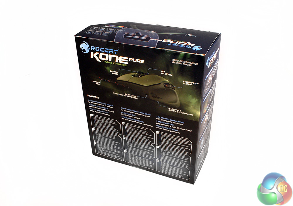 The packaging for the Kone Pure Camo Charge is classic Roccat: high quality, matt cardboard, with the mouse's main features listed in easy to read tabs on the front and written out in more detail on the back in a number of different languages.