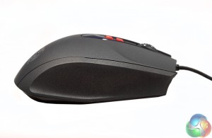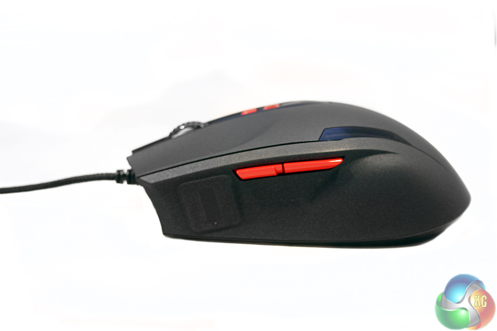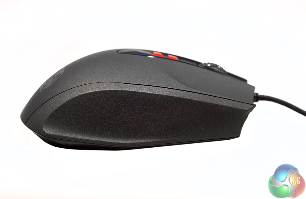 The left hand side features a pair of additional buttons, though no specific thumb grip. Instead it has a bulge in the plastic, which sits neatly against your thumb when using a palm grip. This mouse is definitely designed with that style of hold in mind, though does seem to work with finger grips too.
