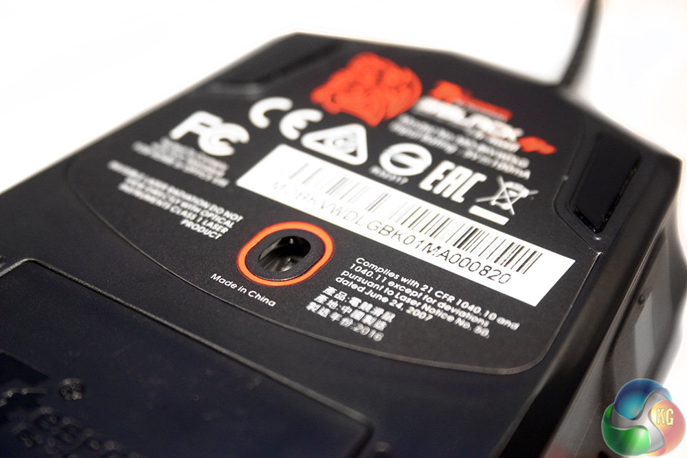 The underside of the mouse has a centrally located laser sensor (AVAGO 9500), with four corner mounted unbranded Teflon mouse feet. At the rear of the underside is where the weight compartment can be found. The panel pops off with a quick press, giving you access to the FP's underbelly.