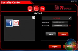 I particularly like how the security software for it lets you customise each login within its vault, as well as providing back ups and secret questions should you lock yourself out. Although I would not necessarily rank Thermaltake up there with the great password security companies of the world, purportedly all passwords are stored in hashed 256bit encrypted files, so they are pretty secure from third party interference.