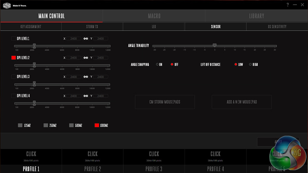 The sensor tab gives you complete control over DPI levels. You can also set different levels of sensitivity in-case you need to cycle to something else mid-game. Aside from that, you can also adjust the polling rate, or calibrate the sensor for your mouse pad, which should help you avoid minor cursor movements when lifting up the mouse to adjust position.