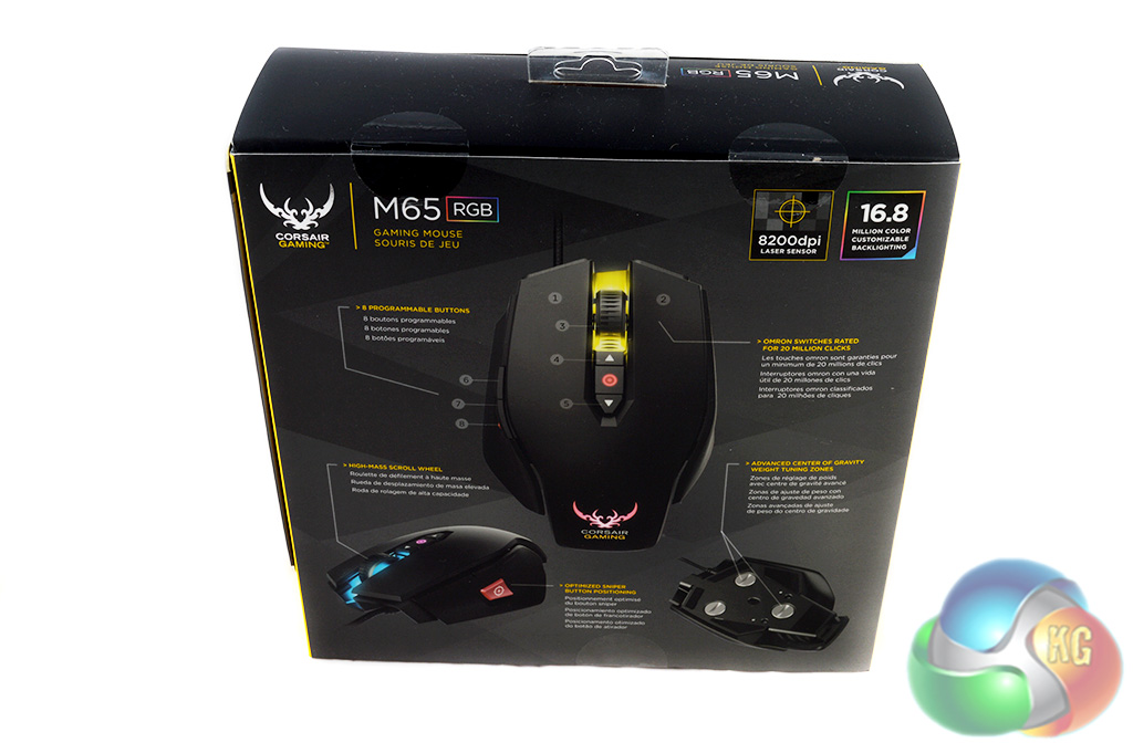 As we continue to look at the box it becomes apparent that Corsair really wants you to notice its fancy back lighting, with repeated mentions of the 16.8 million color rating. Other mentions on the back of the box include re-programmable buttons, adjustable weights along with a ‘high-mass scroll wheel'.