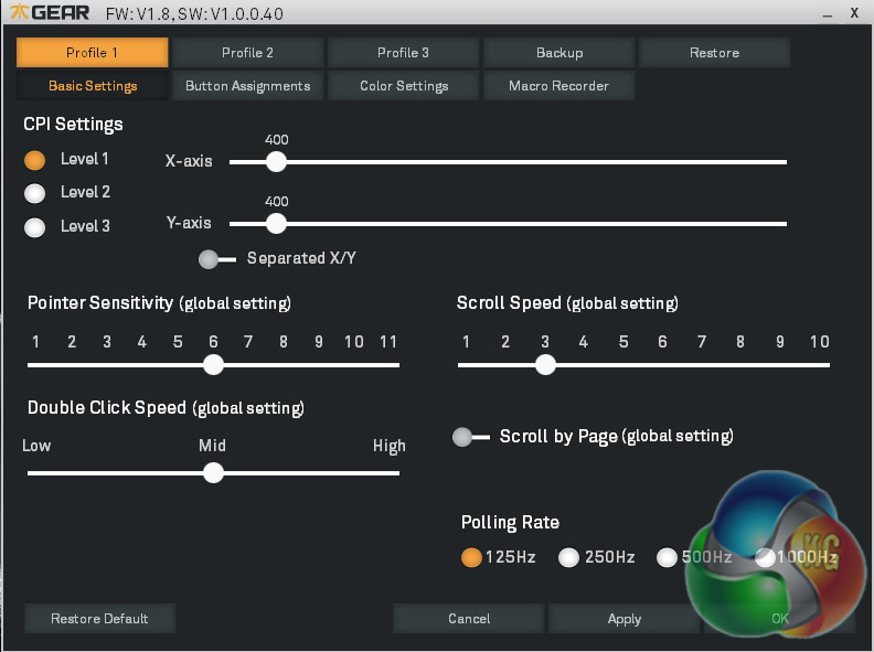 Upon first launching the software, you will be greeted with the DPI levels screen so you can get straight to sorting out mouse sensitivity. You can set a different setting for three different levels, which can be switched between using the button below the scroll wheel.