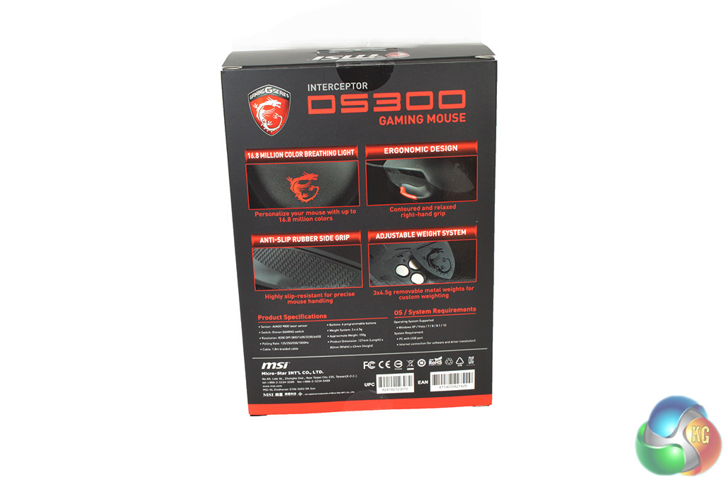 MSI's new gaming mouse comes in standard packaging. You can open up a flap at the front to get a look at it before opening up the box while the back lists off some key features like additional buttons and a weight adjustment system.