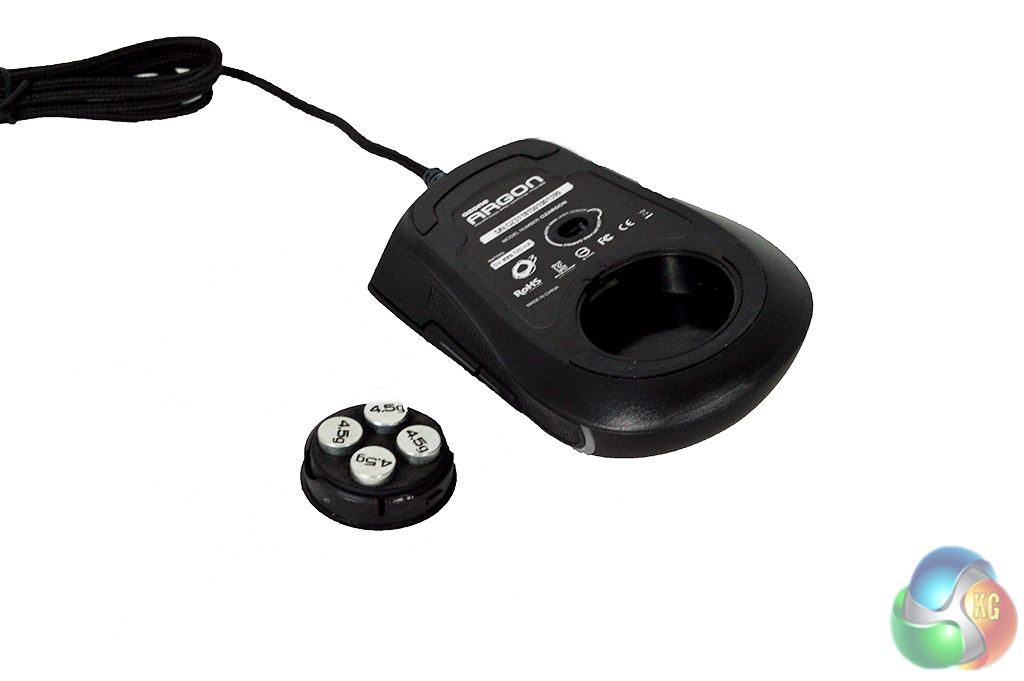 There are four extra weights for the mouse in total. They fit in to the bottom of the mouse and are closed in with a rotating plastic cover that locks into place.