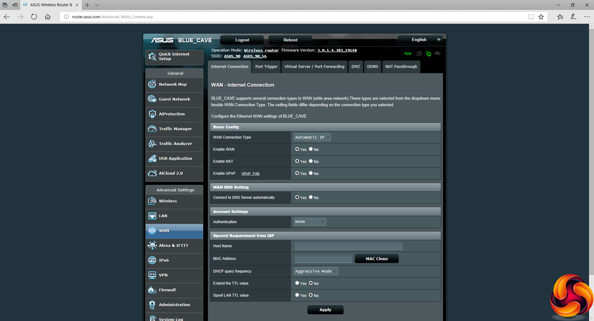 The usual port triggering and forwarding features are available in the WAN section. You can also set up a DMZ and enable NAT passthrough for protocols like SIP telephony and H.323 streaming. The DDNS section supports a wide range of services, including ASUS's own, DynDNS, and No-IP.