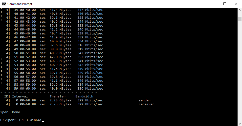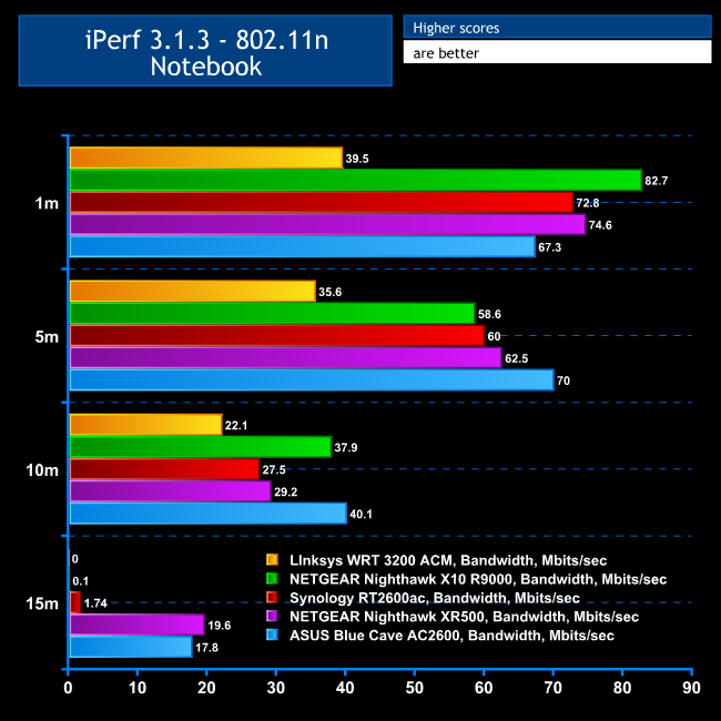 With each WiFi standard and distance, we took 60 readings of throughput at one second intervals and calculated the average (iPerf does this automatically). For these tests, we are also comparing the Blue Cave’s performance with the NETGEAR Nighthawk XR500, Linksys WRT 3200 ACM, NETGEAR Nighthawk X10 R9000, and Synology RT2600ac.