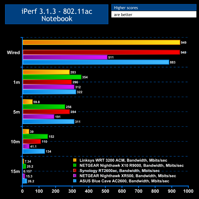 The Blue Cave outperformed the NETGEAR Nighthawk XR500 and Synology RT2600ac, but the Linksys WRT3200AC and NETGEAR Nighthawk X10 R9000 were considerably quicker.