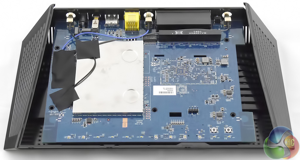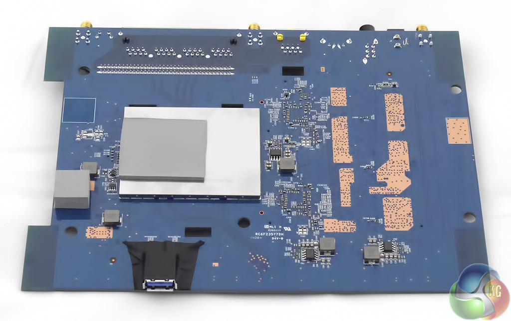 Whip out five screws from the bottom of the casing (four of them under the rubber feet), pop the lid off the casing and the innards are revealed. The hardware is mounted on a single PCB with an EMI shield on the top and heatsink on the bottom. There are three thermal pads to conduct heat to the bottom casing. During our testing of the router the chassis felt slightly warm but was never hot or uncomfortable to touch.