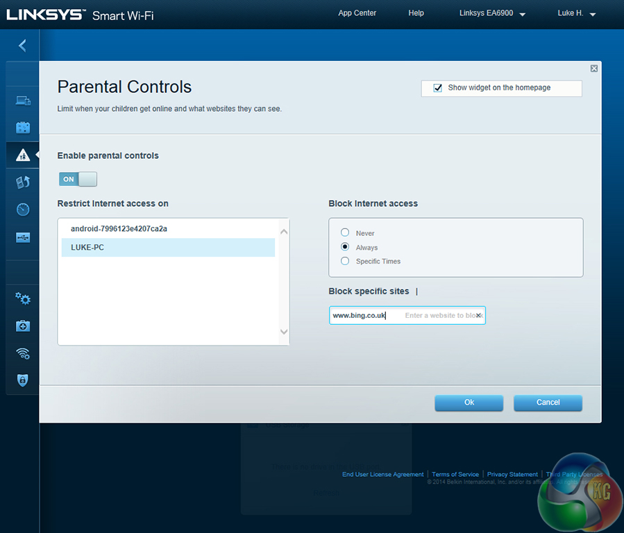 Linksys incorporates an easy-to-use Parental Controls section. The tool can be used to easily adjust the access of a specific device to user-determined webpages. We tested out the operation and found it to work well.