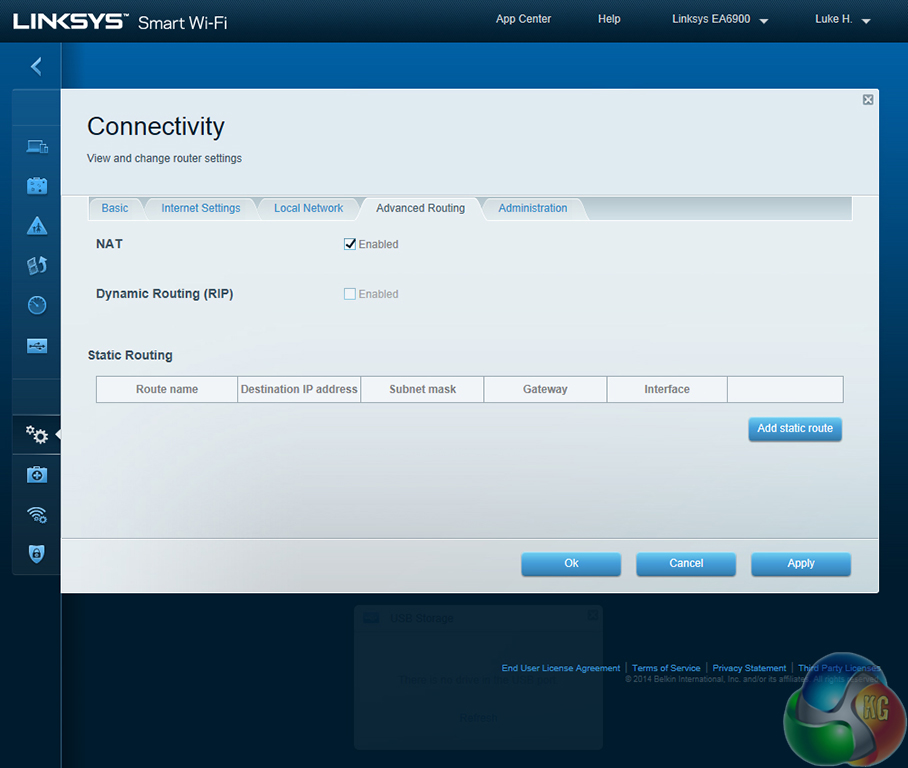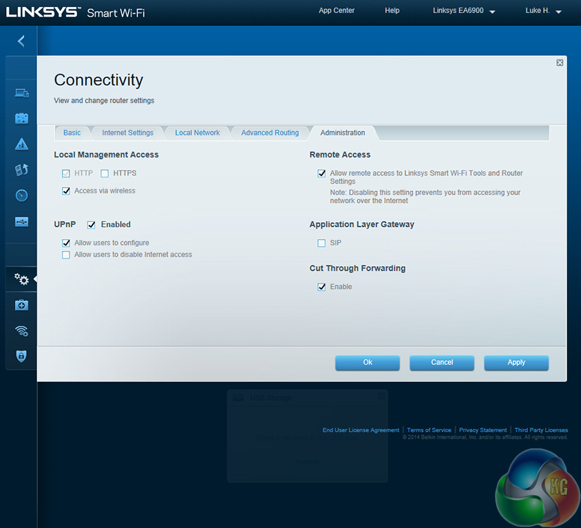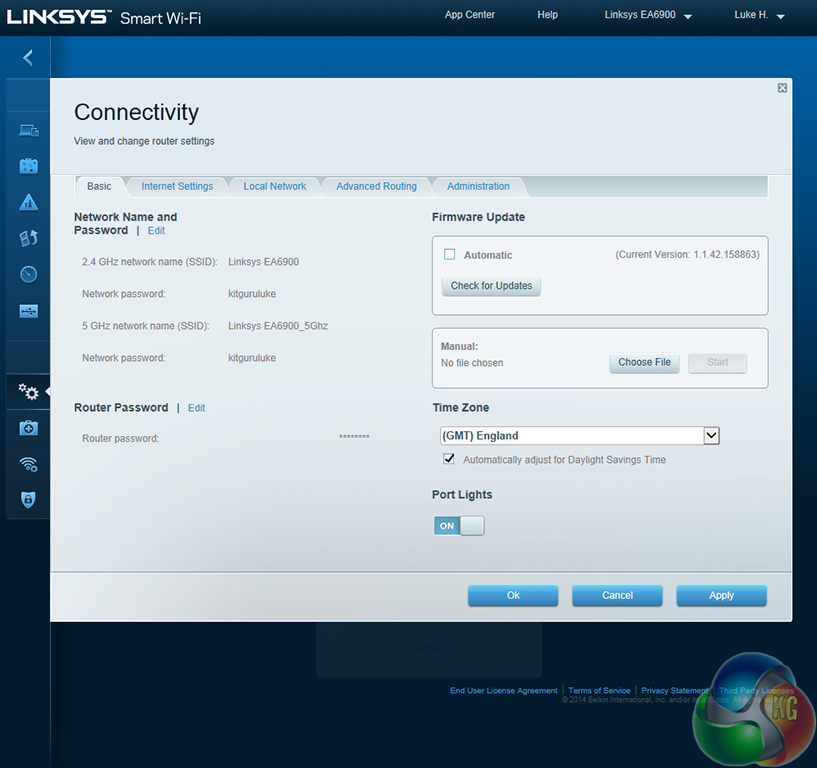 Connectivity is just one of the sections that allows the network's name and password to be changed. Firmware updates can be applied to the router via the connectivity section; Linksys permits for them to be applied in a manual or automatic manner.