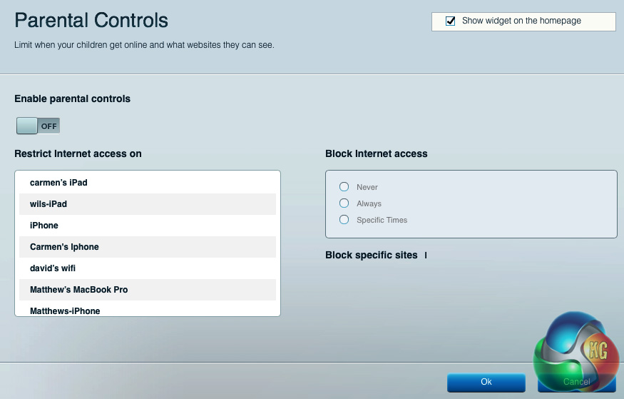 Linksys also incorporates a parental control panel, which allows you to restrict Internet access on certain devices connected to the network. You can also block select sites for select devices. The parental controls are extensive and very easy to set up.