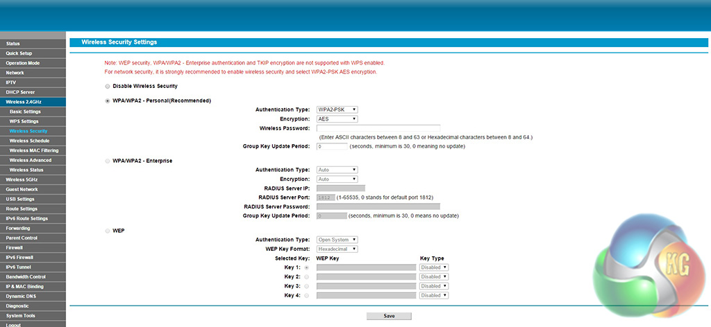 The wireless security settings are fairly extensive, giving a wide array of options for protecting your network.