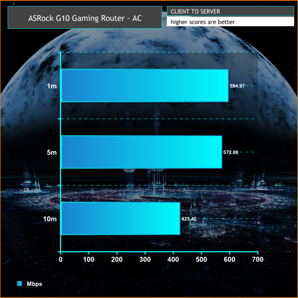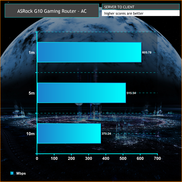 The 802.11ac results here are very good. While a few routers in this same test environment have managed speeds close to 700Mb/sec, the ASRock G10 still does fine, with approximately 600Mb/sec at close range, and around 275-300Mb/sec at long range.