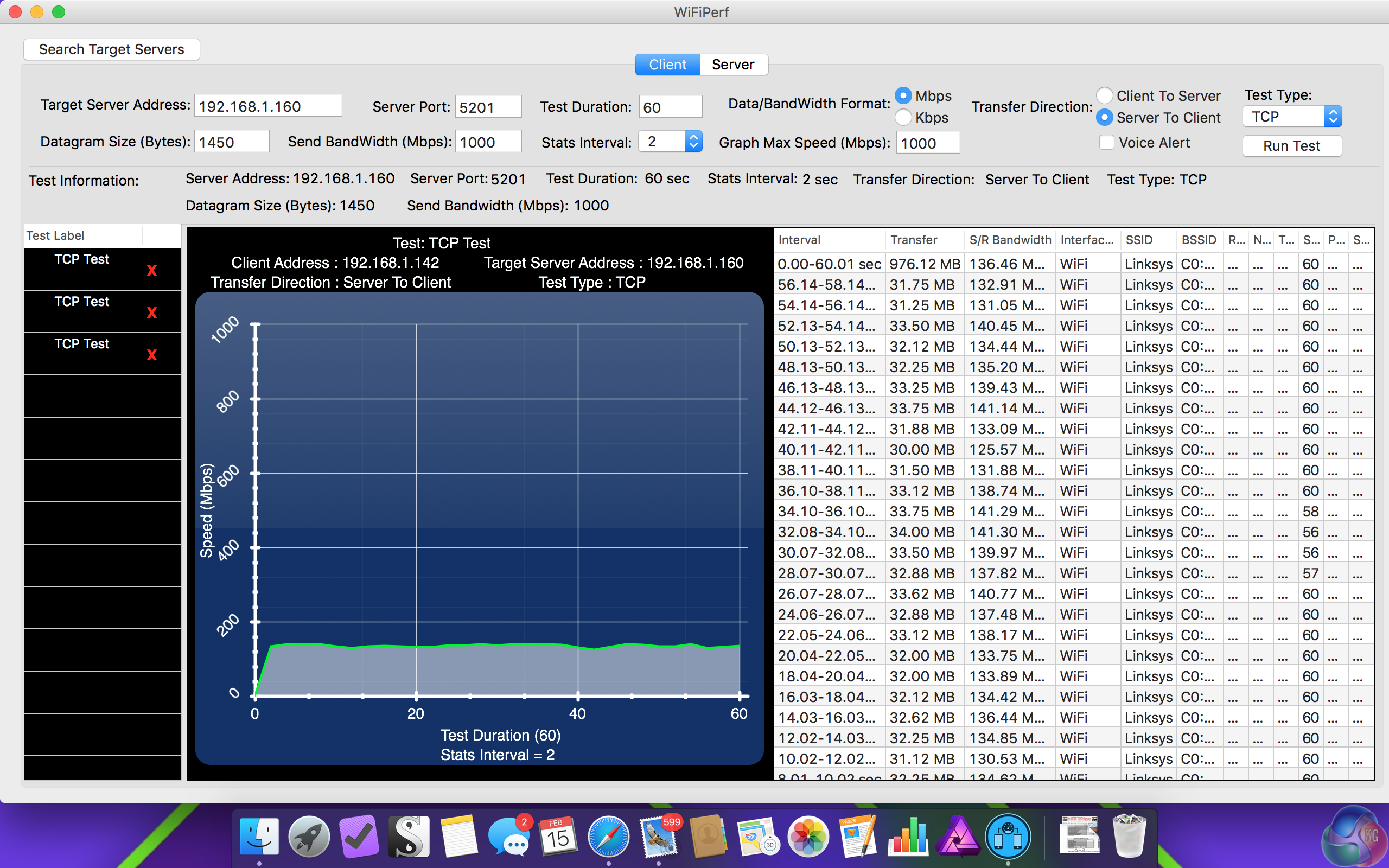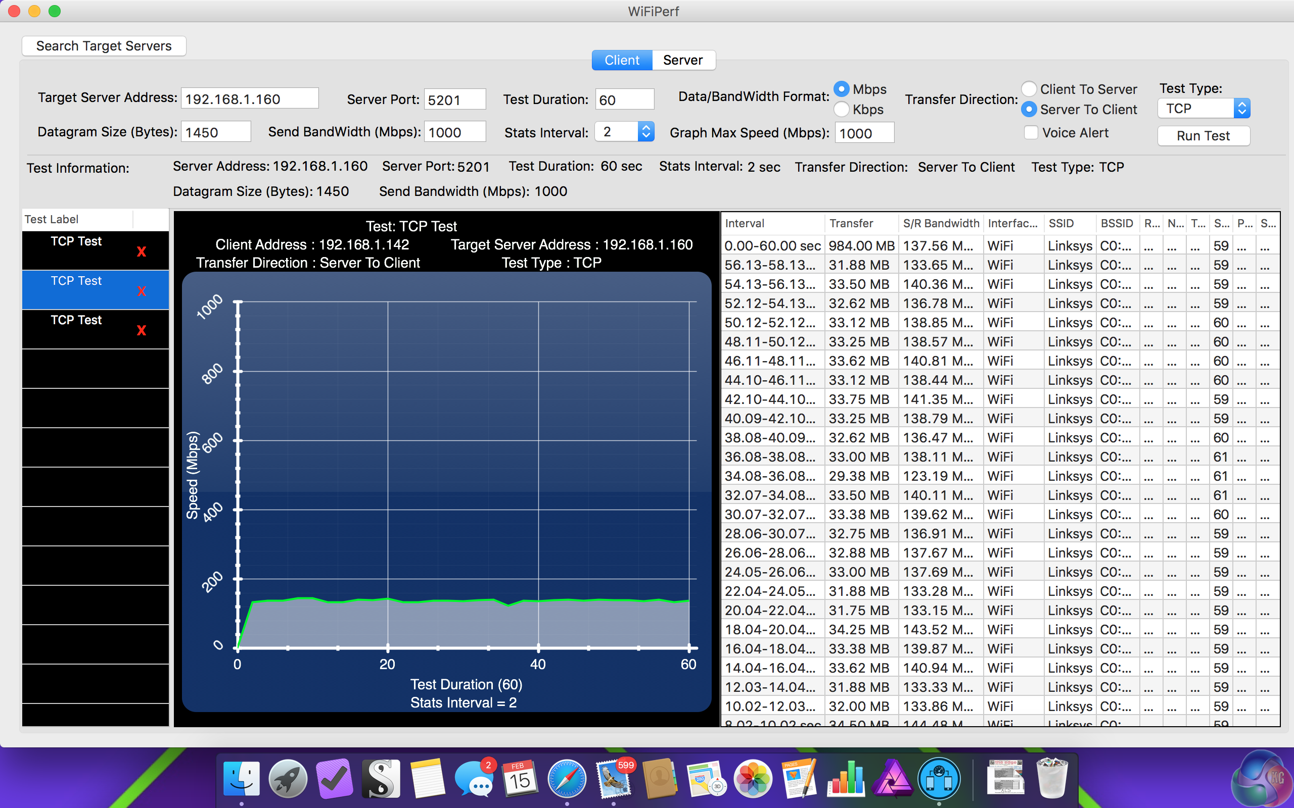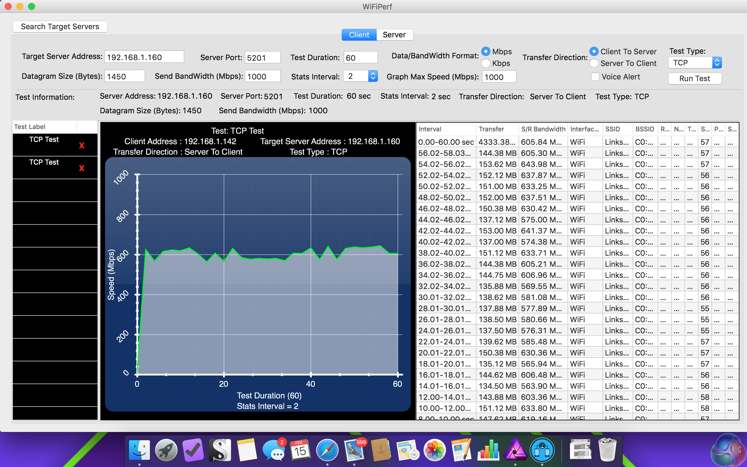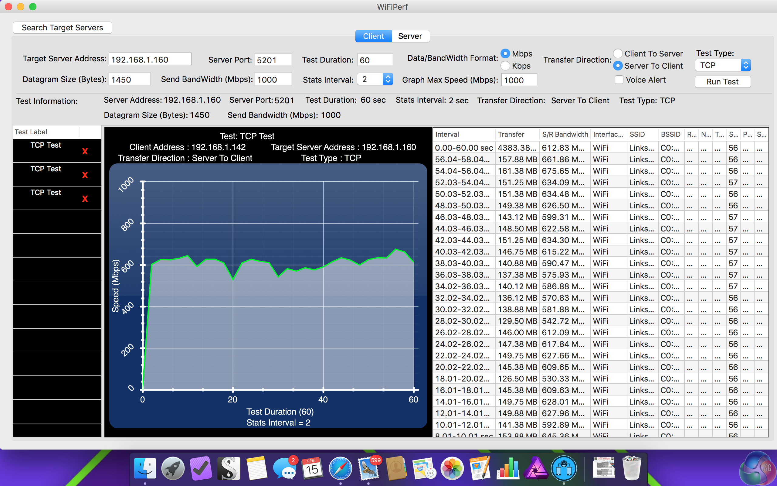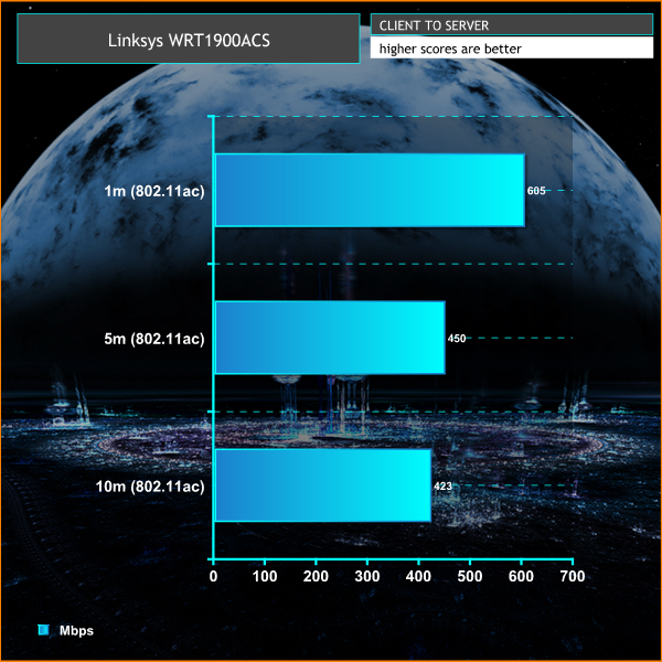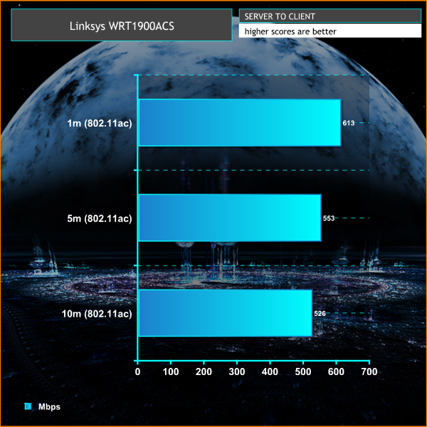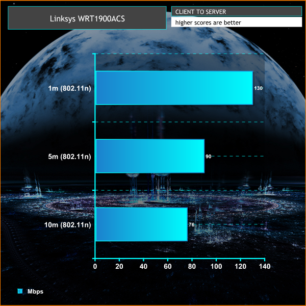 We use the WiFi Perf software, which measures both client-to-server (c2s) and server-to-client (s2c) performance, and we tested both 802.11n and 802.11ac at 1m, 5m and 10m with direct line of sight to the router.