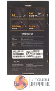The TUF Gaming A1 comes in a stout box with a good clear image of the enclosure on the front. Under the image are two small icons for the IP68 and MIL-STD-810H 516 standards that the enclosure passes.