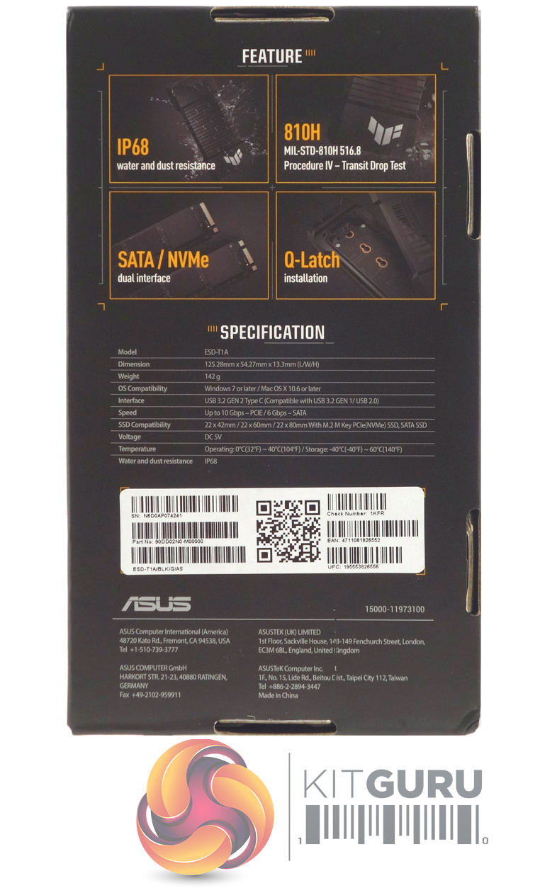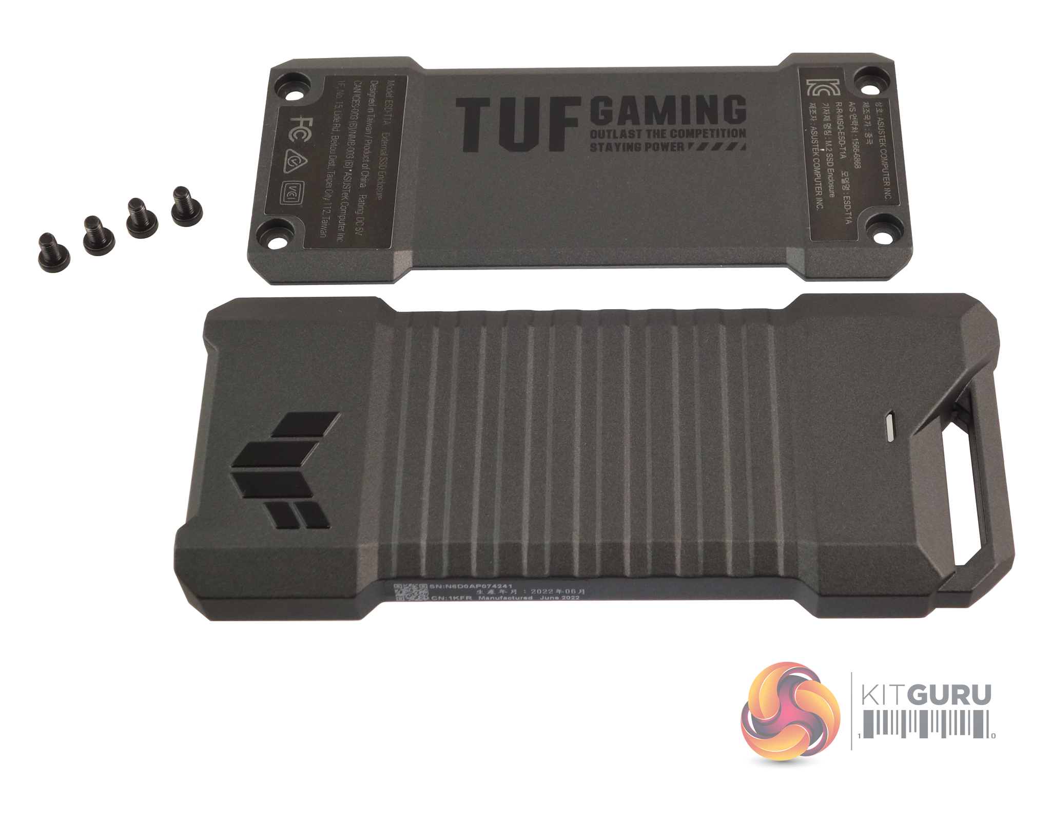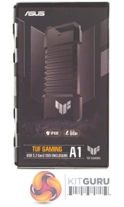 The TUF Gaming A1 is of aluminium construction measuring 125.8 x 54.27 x 13.3mm and weighs in at 142g. Finished in a dark grey the front of the enclosure has the TUF logo on it at one end and at the other end, a recessed white drive activity LED. The back cover displays drive information on it.