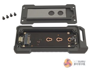 The back cover of the enclosure is held in place by four Allen head bolts (an Allen key is bundled with the drive). The backplate has some TIM (thermal interface material) installed on it. The TUF Gaming A1 supports 2242, 2260, and 2280 NVMe or SATA 6Gb/s M.2 SSDs up to 2TB in capacity.