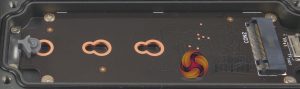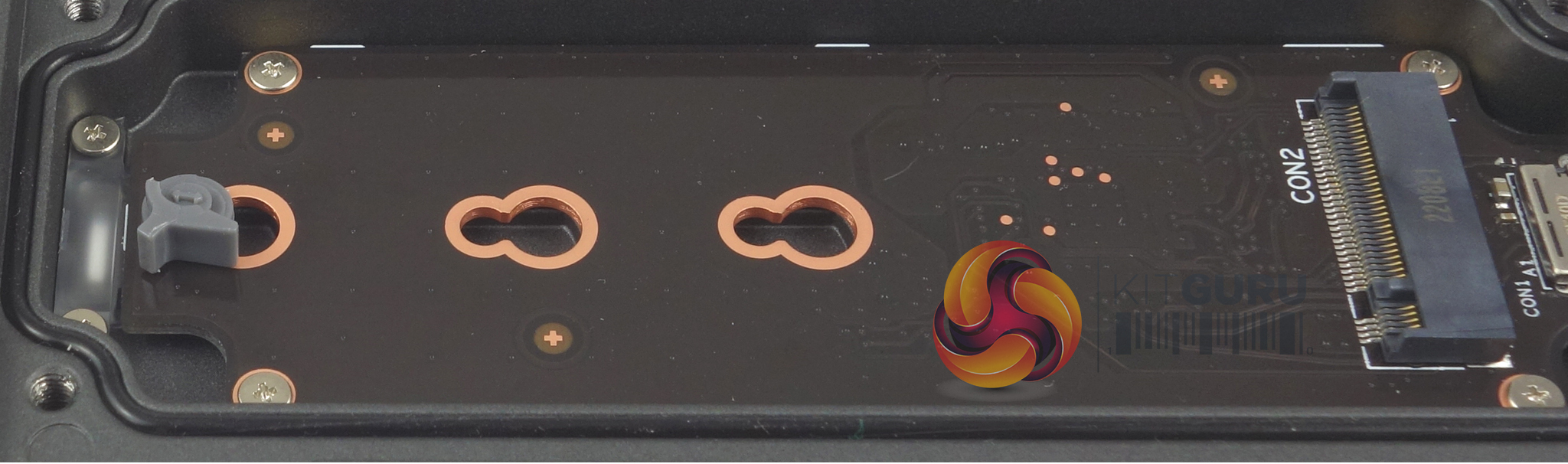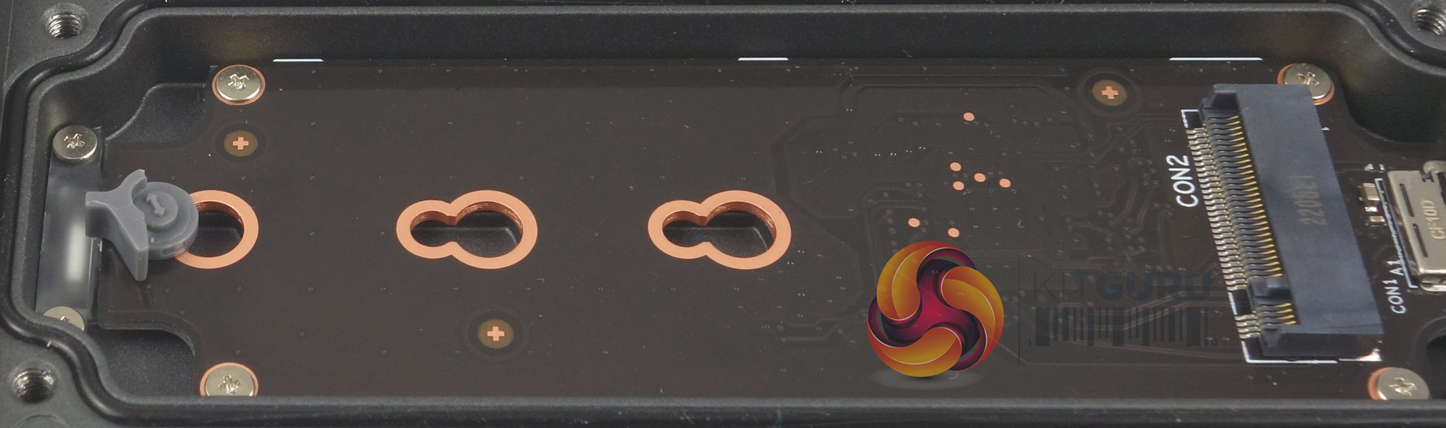 Holding the drive in place is the cleverly designed ASUS tool-free Q-Latch system. The latch swivels to a horizontal position to lock the drive in place but turning it vertically allows it to be removed and placed in one of the two other slots to enable smaller drives to be installed. Drives with heatsinks cannot be fitted but ones that have a layer of metal such as copper built in the label are fine.