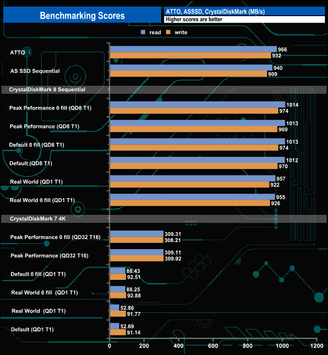 AS SSD is a great free tool designed just for benching Solid State Drives. It performs an array of sequential read and write tests, as well as random read and write tests with sequential access times over a portion of the drive. AS SSD includes a sub suite of benchmarks with various file pattern algorithms but this is difficult in trying to judge accurate performance figures.