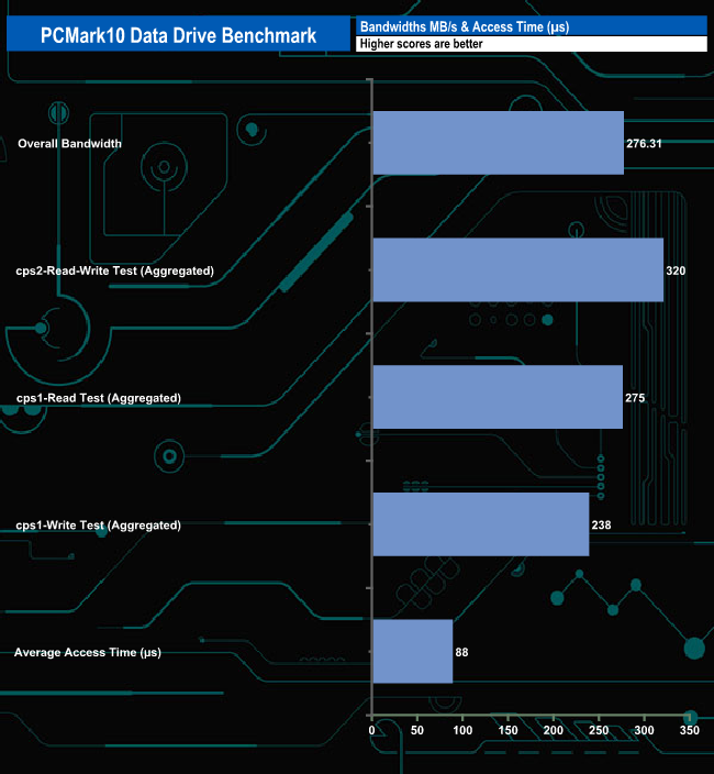 Using a Gen 4 SSD in the TUF Gaming A1 produced, as you might expect, pretty good results in the PCMark 10 Data Drive Benchmark with an overall bandwidth figure for the test run of 276.31MB/s. Best of the individual test traces was the cps2 Read-Write test with a bandwidth of 320MB/s.
