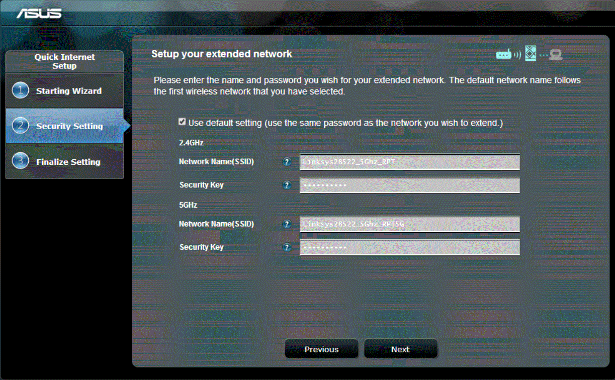 Then you can adjust the SSID and Security Keys of the extended network, before confirming the settings in the third stage.