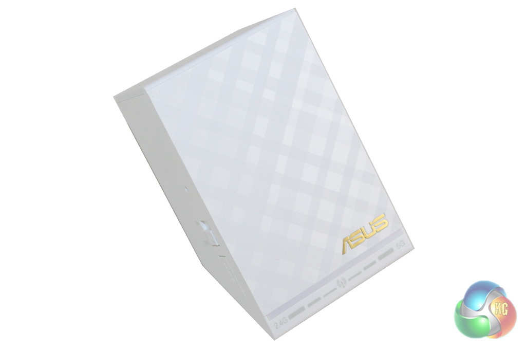 Despite its boxy form, the RP-AC52 is quite attractive to look at. The outer plate is finished in gloss-white plastic with an inlaid criss-cross pattern. Along the bottom edge of the front plate there is a series of indicator lights which display the signal strength on both 2.4 GHz and 5 GHz networks.