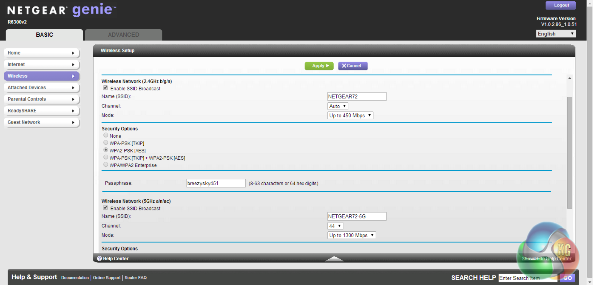 We can configure all of the wireless settings under the ‘Wireless' tab, for 2.4 GHz and 5 GHz channels independently.