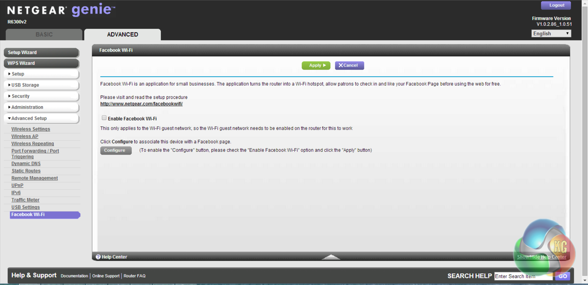 ‘Administration' brings up the router's settings, and ‘Advanced' brings up various further settings. One particularly interesting feature is ‘Facebook Wi-Fi' which lets guests connect to the router and gives them internet access once they have liked your Facebook page.
