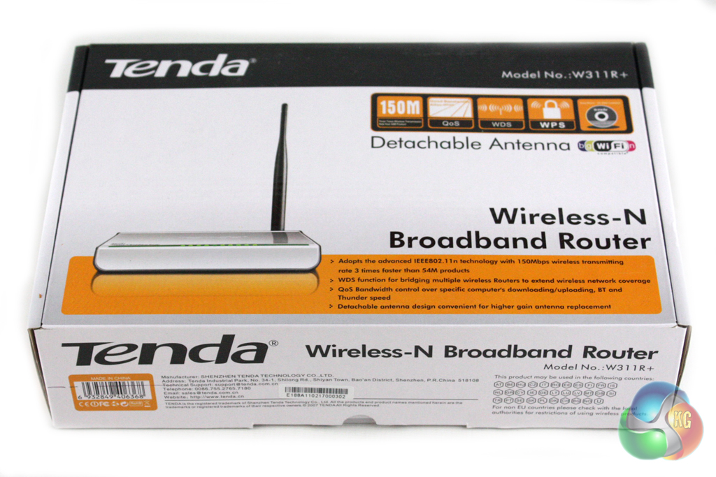 The Tenda W311R+ is supplied in a fairly substantial box which features a black, white and yellow livery. The front of the box features a large image of the router within and details some of the key features of the router.