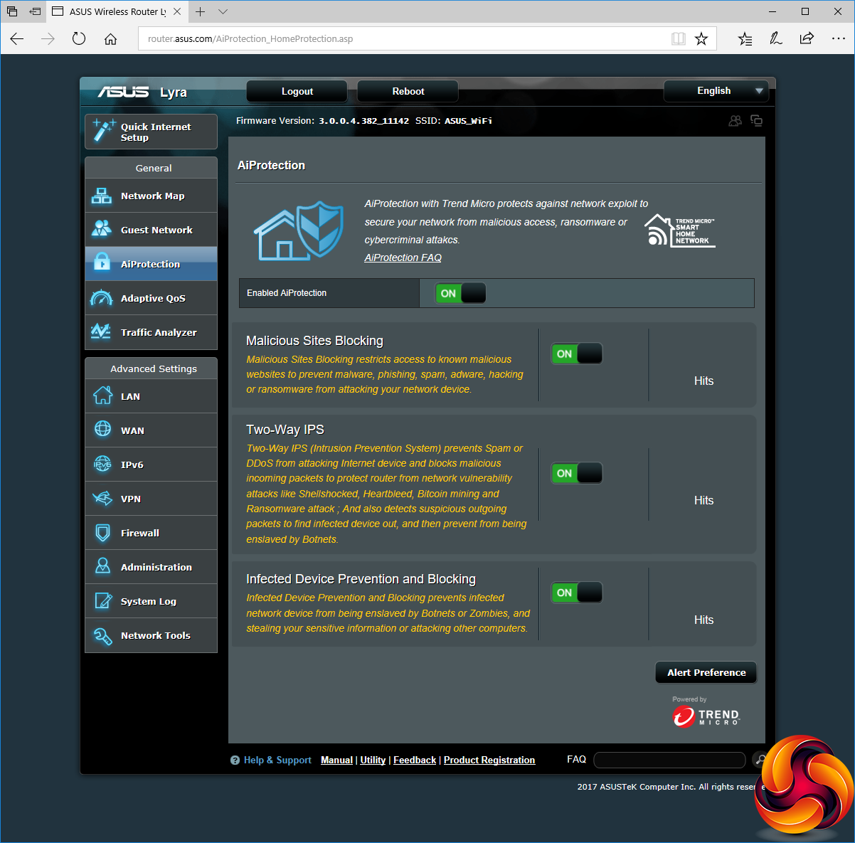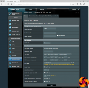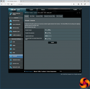Although AiProtection already provides firewall facilities, there are advanced firewall configuration options also available. This includes Denial of Service protection, which strangely is off by default. You can block by URL, keyword, or network service type. There are separate configuration options for IPv6. The Administration section provides sundry utilities such as firmware updating and NTP time server options.