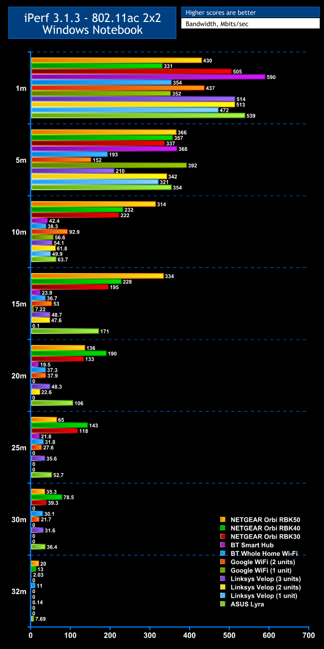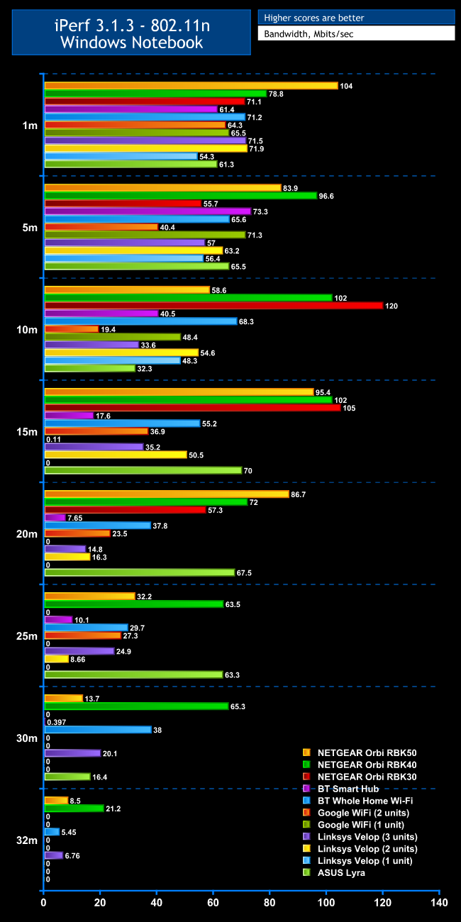 The 2.4GHz 802.11n results are almost as impressive as the 802.11ac ones. At 1m close proximity, the throughput of 61.3Mbits/sec is nothing to write home about, but 65.5Mbits/sec at 5m is in the middle of the pack. At 10m, 32.3Mbits/sec is one of the slowest results. But, as with 802.11ac, performance leaps up considerably at 15m, with 70Mbits/sec, and from here on out the Lyra posts impressive throughput. The latter 10m result places the Lyra fourth, with only the NETGEAR Orbis ahead.