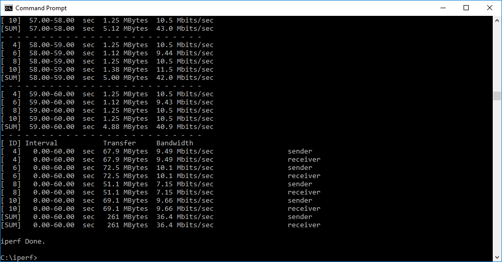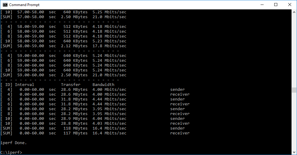 Note that the client command sends four streams of data simultaneously, simulating a multi-client connection as closely as possible with just one client. It takes 60 throughput readings at one second intervals and then averages the result.
