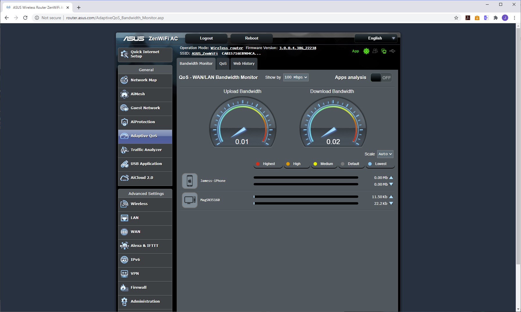 The next option on the menu lets you configure the mesh WiFi, adding more units if you have them. Next along is the ability to set up a guest WiFi network. The AiProtection system is a bit more explicit in the Web interface than the app, with options for configuring the firewall features and parental controls that ASUS groups under this category. Similarly, the Adaptive QoS section offers a bit more fine tuning than the app. The Traffic Analyser provides lots of detail about network throughput and where it's coming from.