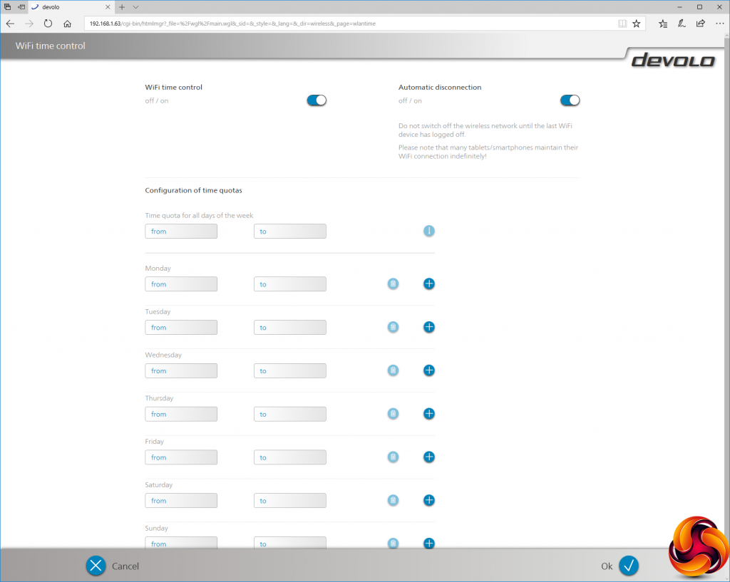 WiFi time control lets you turn the WLAN signal on and off at different times for each day of the week, or you can use the same setting for all seven days.