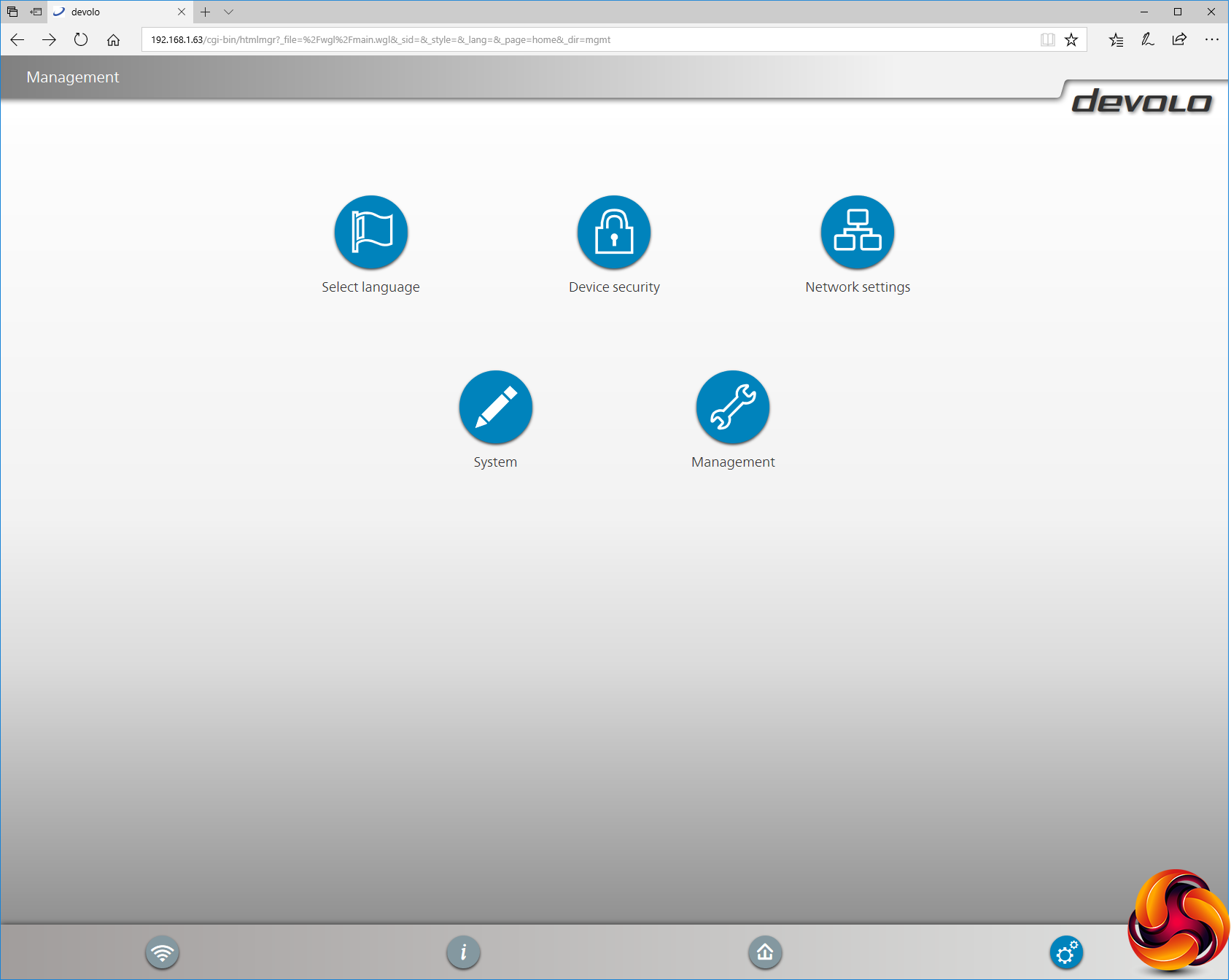 Sundry management options can be accessed via the cog icon on the bottom right. These include language selection, creating a static IP address, controlling password access to the device, firmware updates, plus date and time.
