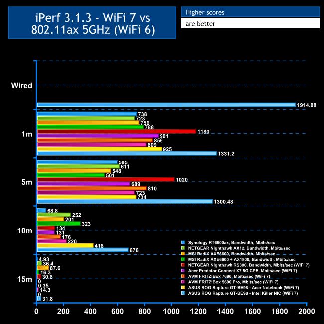 With each WiFi standard and distance, we took 60 readings of throughput at one-second intervals and calculated the average (iPerf does this automatically). We tested the Asus ROG Rapture GT-BE98 results against the MSI Radix AXE6600, NETGEAR Nighthawk X10 R9000, Synology RT2600ac, NETGEAR Nighthawk XR500, NETGEAR Nighthawk XR700, Synology RT6600ax, NETGEAR Nighthawk AX12, NETGEAR Nighthawk RS300, Acer Predator Connect X7 5G CPE, AVM FRITZ!Box 7690, and AVM FRITZ!Box 5690 Pro.