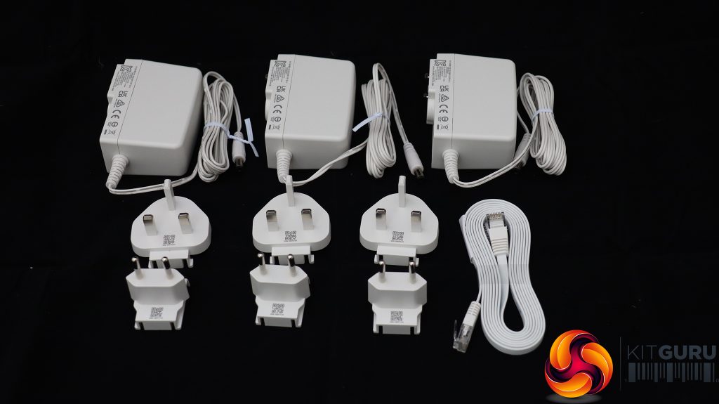 Aside from the three units, there are three power cables with a choice of UK or European power connectors, plus a ribbon Ethernet cable.