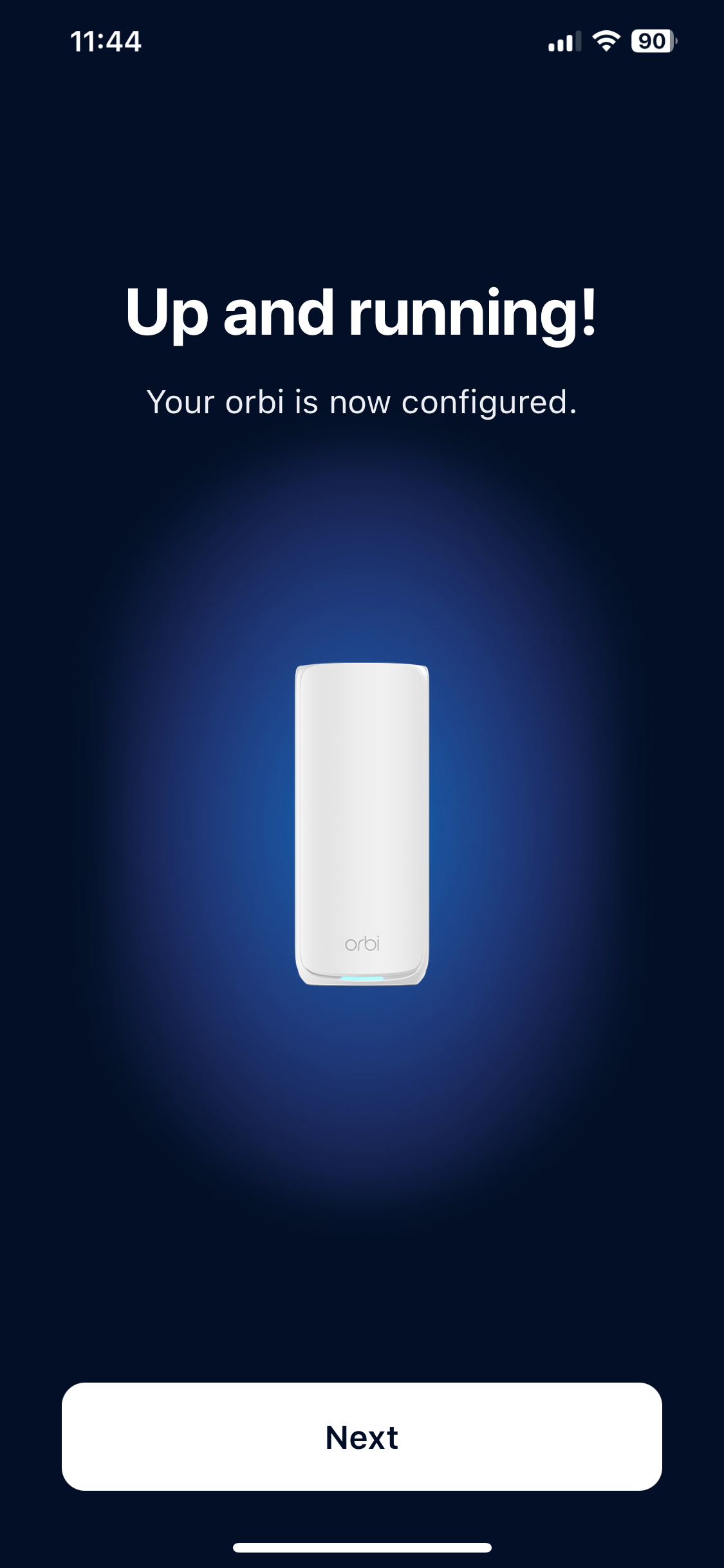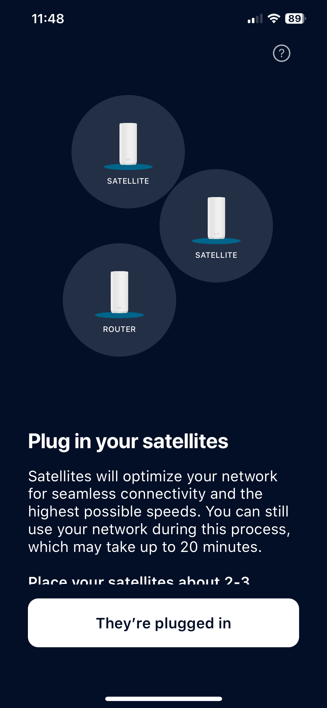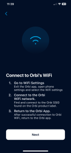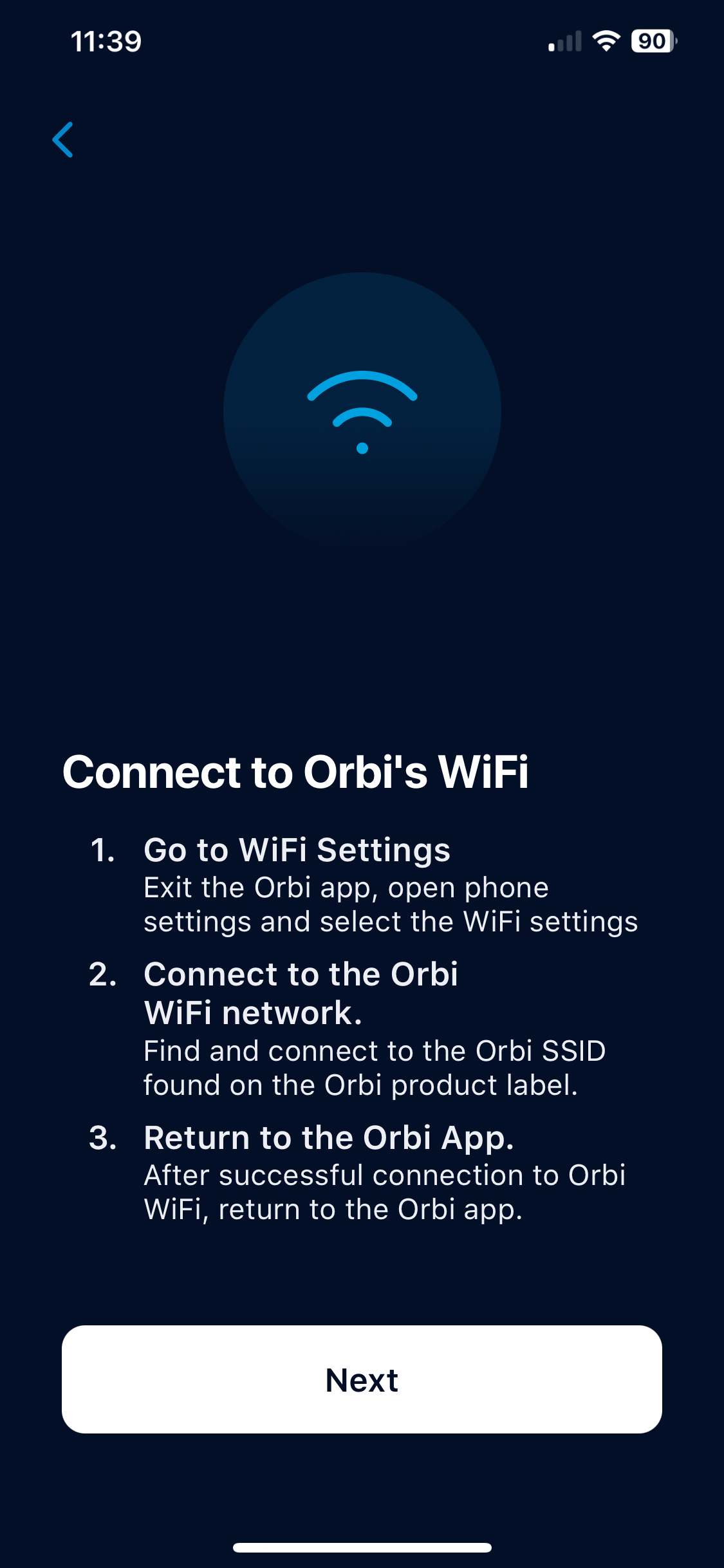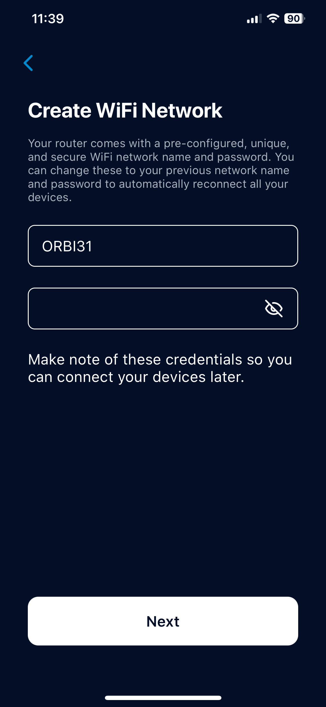 The smartphone app wizard first sets you up with a NETGEAR account, or you can log into an existing one. It will then prompt you that your Orbi isn't configured, and will guide you through the process, starting with plugging everything in. You then connect to the Orbi's WiFi using the details on the front of the router or on the bottom of any of the devices. You're then led through creating your WiFi network, setting up an admin login plus security questions, and adding the satellites to the mesh.