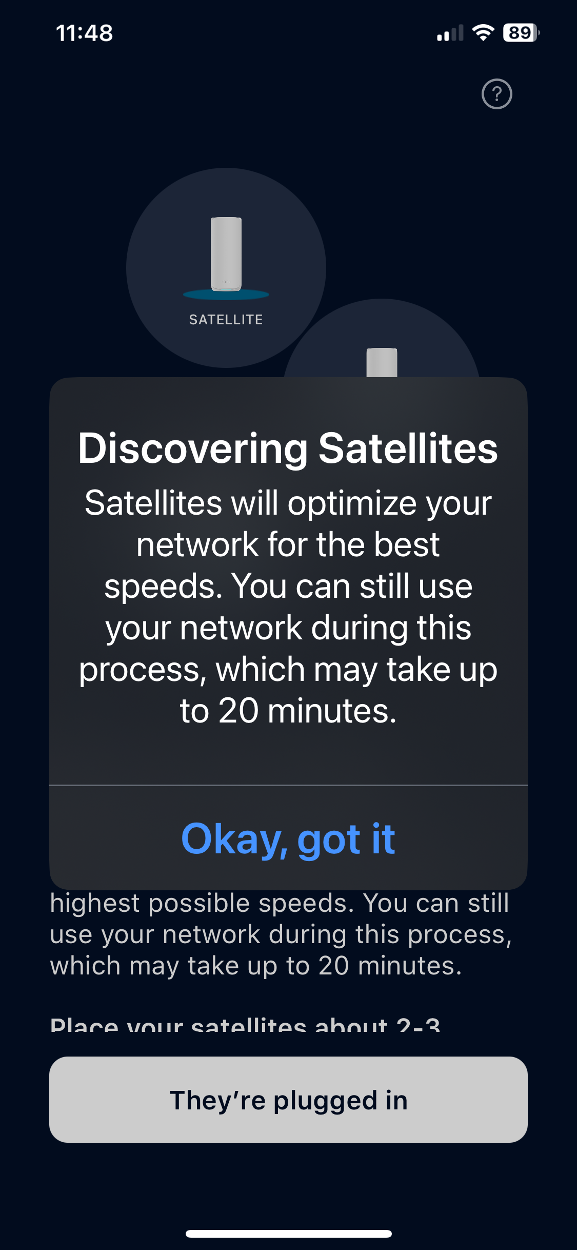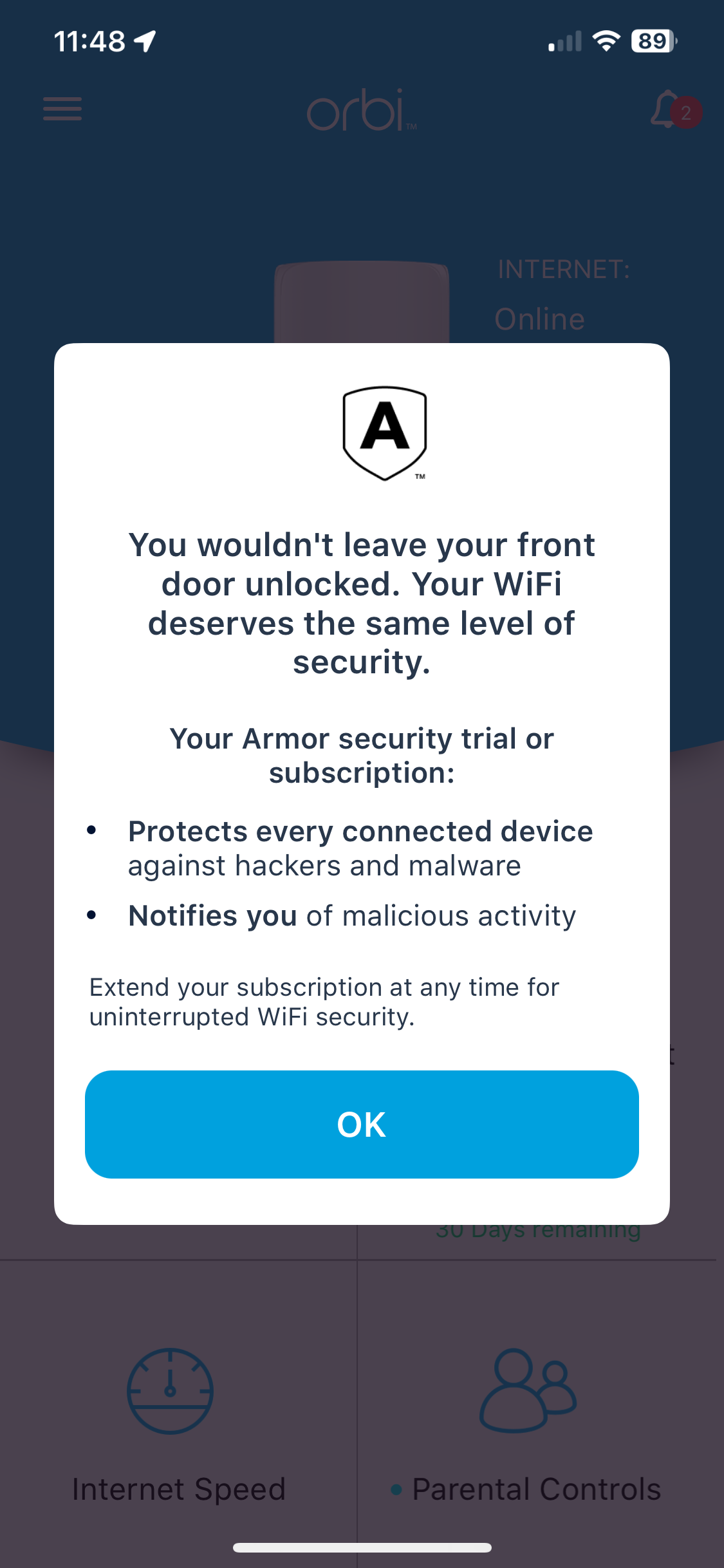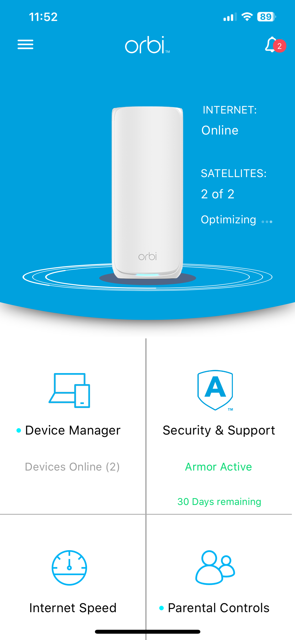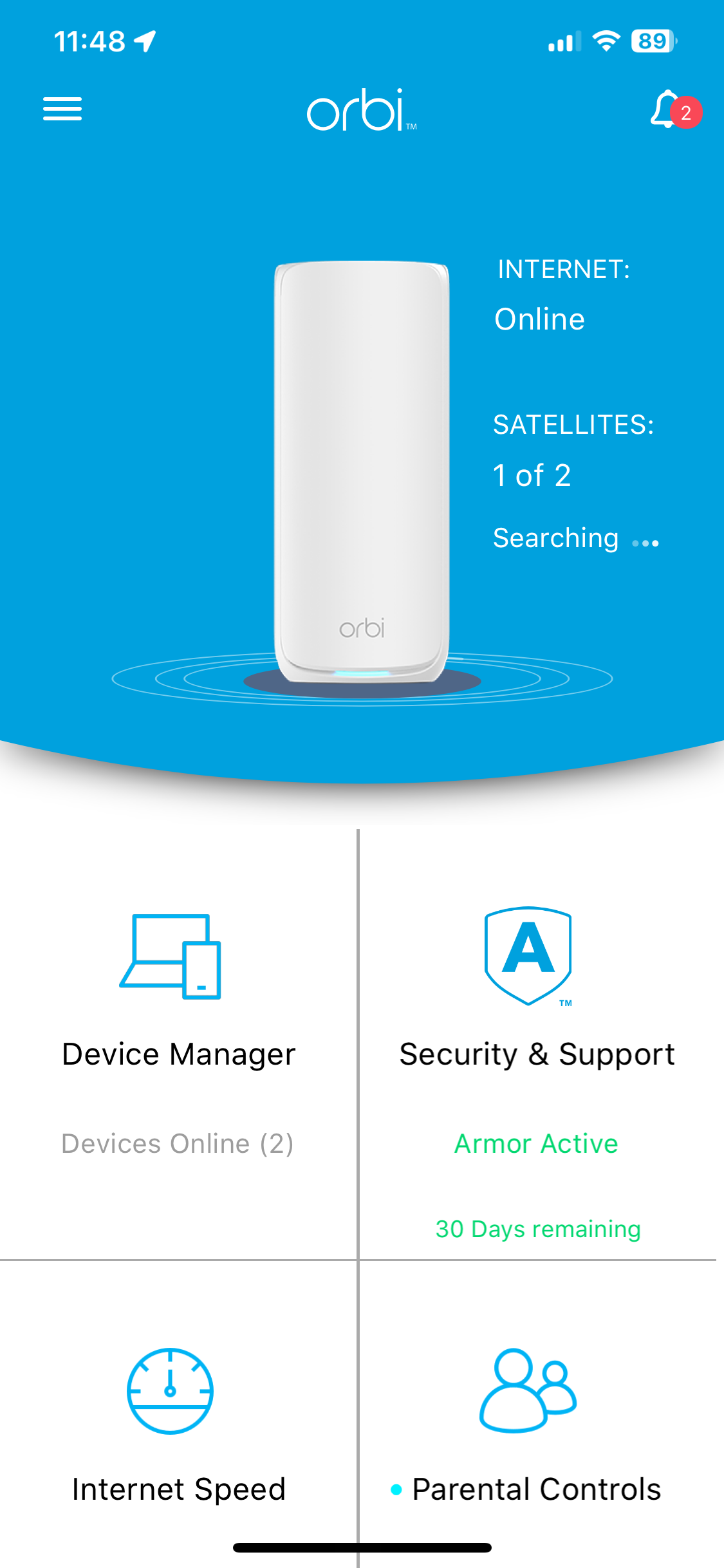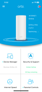 Once your system is operational, you can get into the smartphone management interface, starting with a prompt to enable the rather meagre 30-day trial of NETGEAR's Armour system. Initially, your system could still be finding and optimising the satellites. You'll also be prompted to configure Parental Controls, another subscription-based service, which costs £59.99 a year although you get 60% off for the first year, so it's £24.