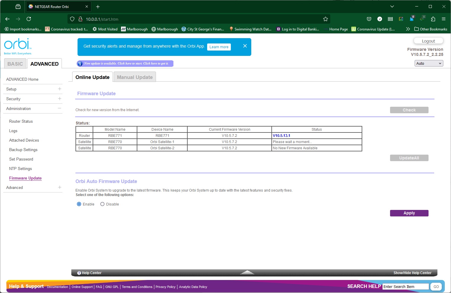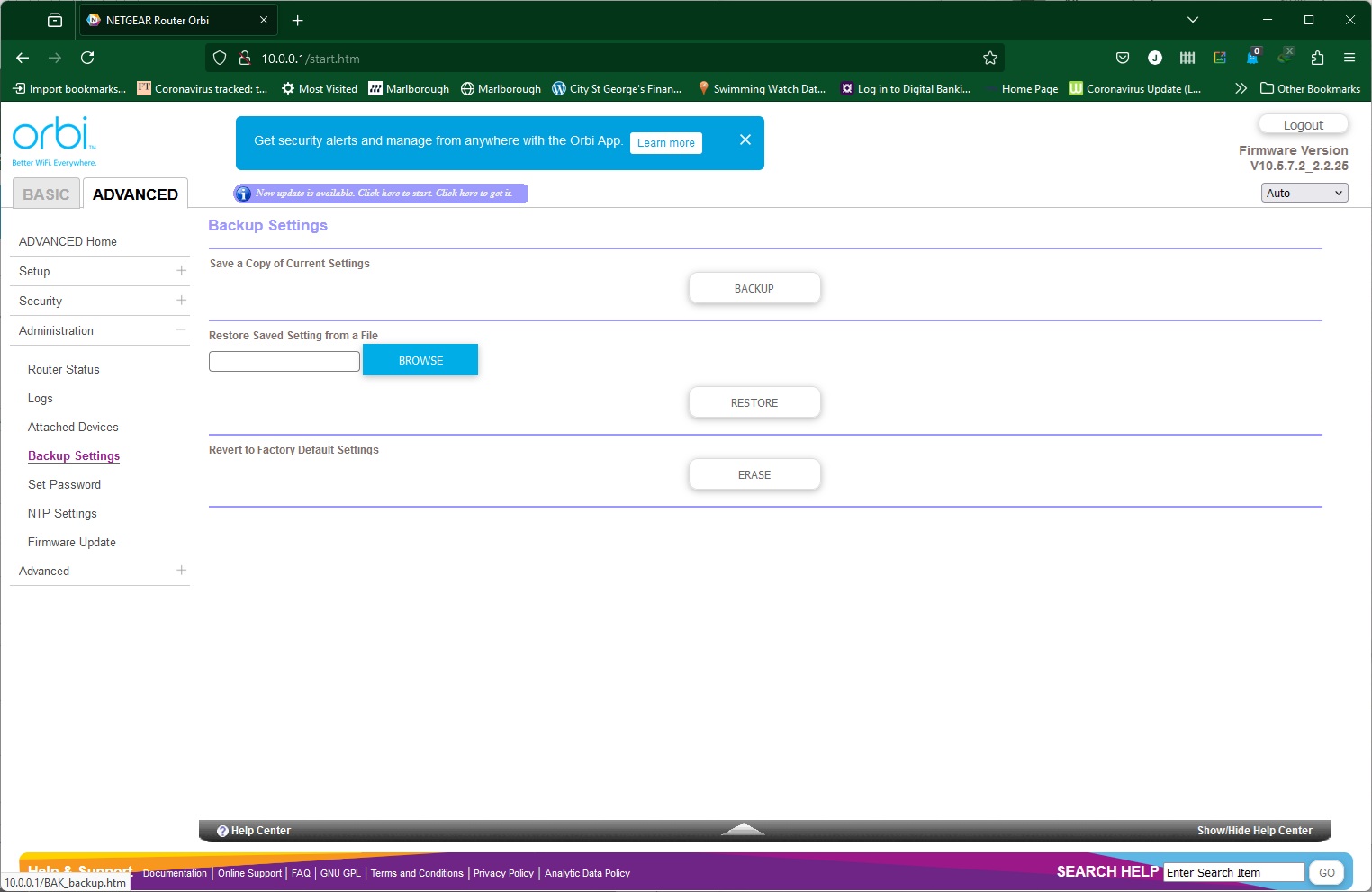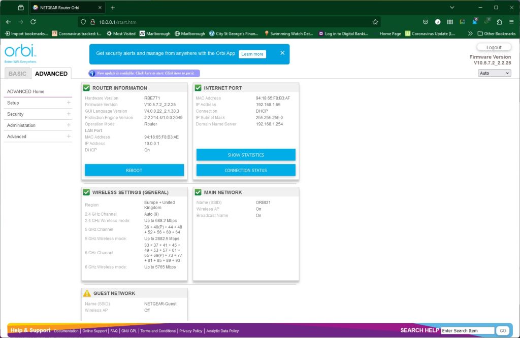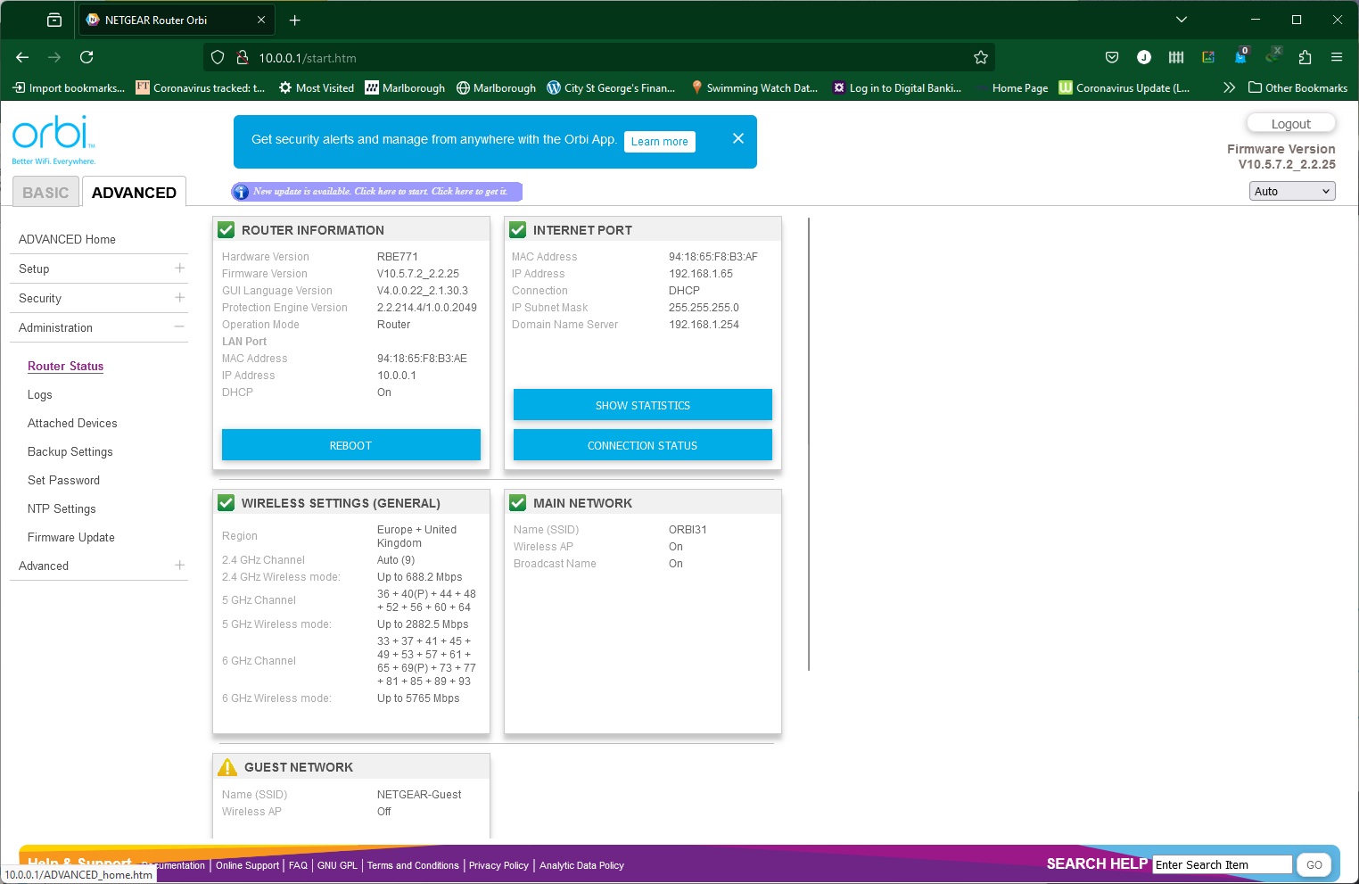 In the Router Status section you get yet another overview of the current main settings. You can browse the activity logs and choose which ones to track. There's another view of attached devices, and you can backup your router settings, as well as changing the admin password plus security questions. Although NETGEAR has its own NTP time server to set the router's clock, you can choose to use a different one if you want. Finally, the Firmware Update section will scan the router and satellites to see if there is new software to install.