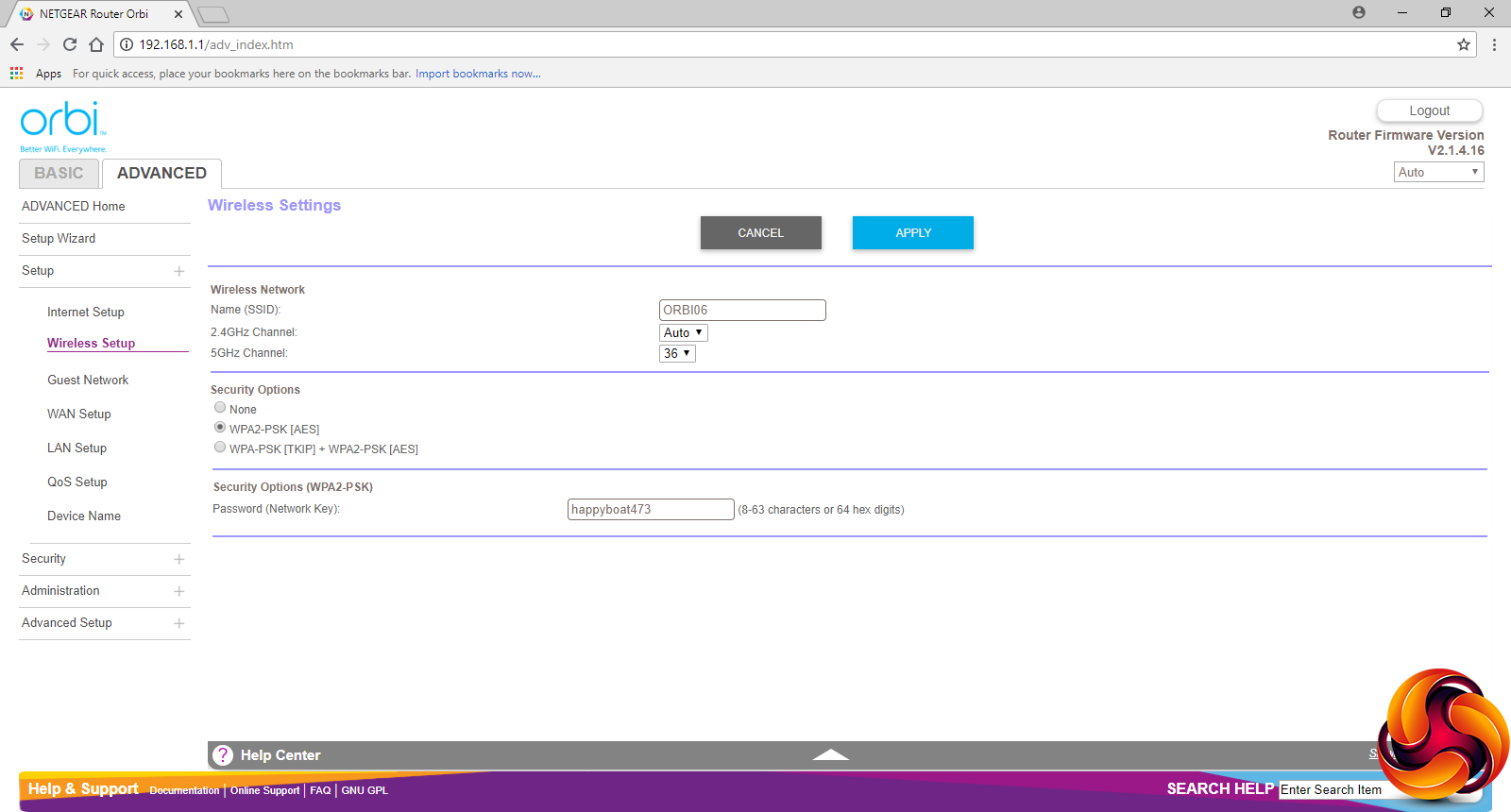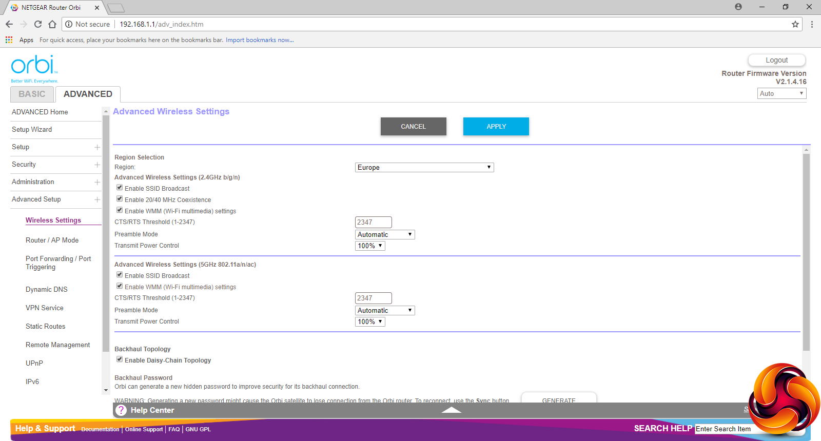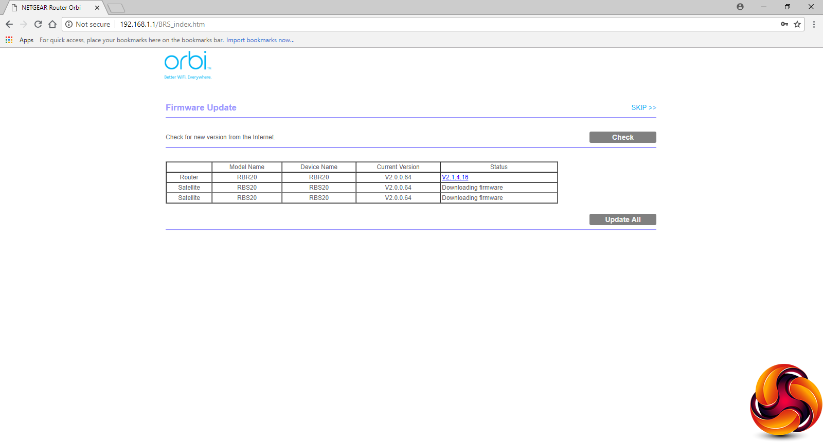 Next, you create an admin password and confirm (or change) the SSID and password for your WiFi. You can then review your settings and print them out if you want a paper record. If you're using the Orbi through an existing router, you will be notified of this. Then the system will check for firmware updates, download them, and give you the opportunity to update the router and all satellites in one go.