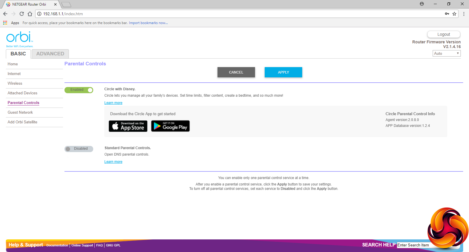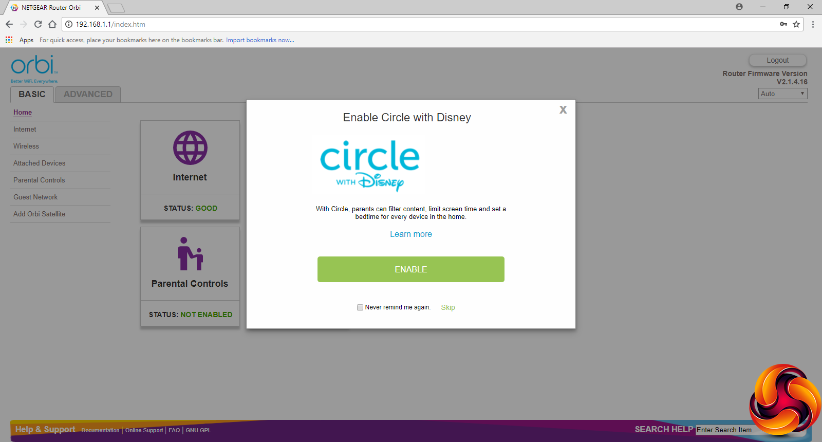 Speaking of Circle, this is now such an important feature for NETGEAR that when you first login to the main Orbi admin insterface, you're prompted to enable the service. You can also enable basic Open DNS parental controls, but only one service can be used at a time. If you enable Open DNS you have to disable Circle.