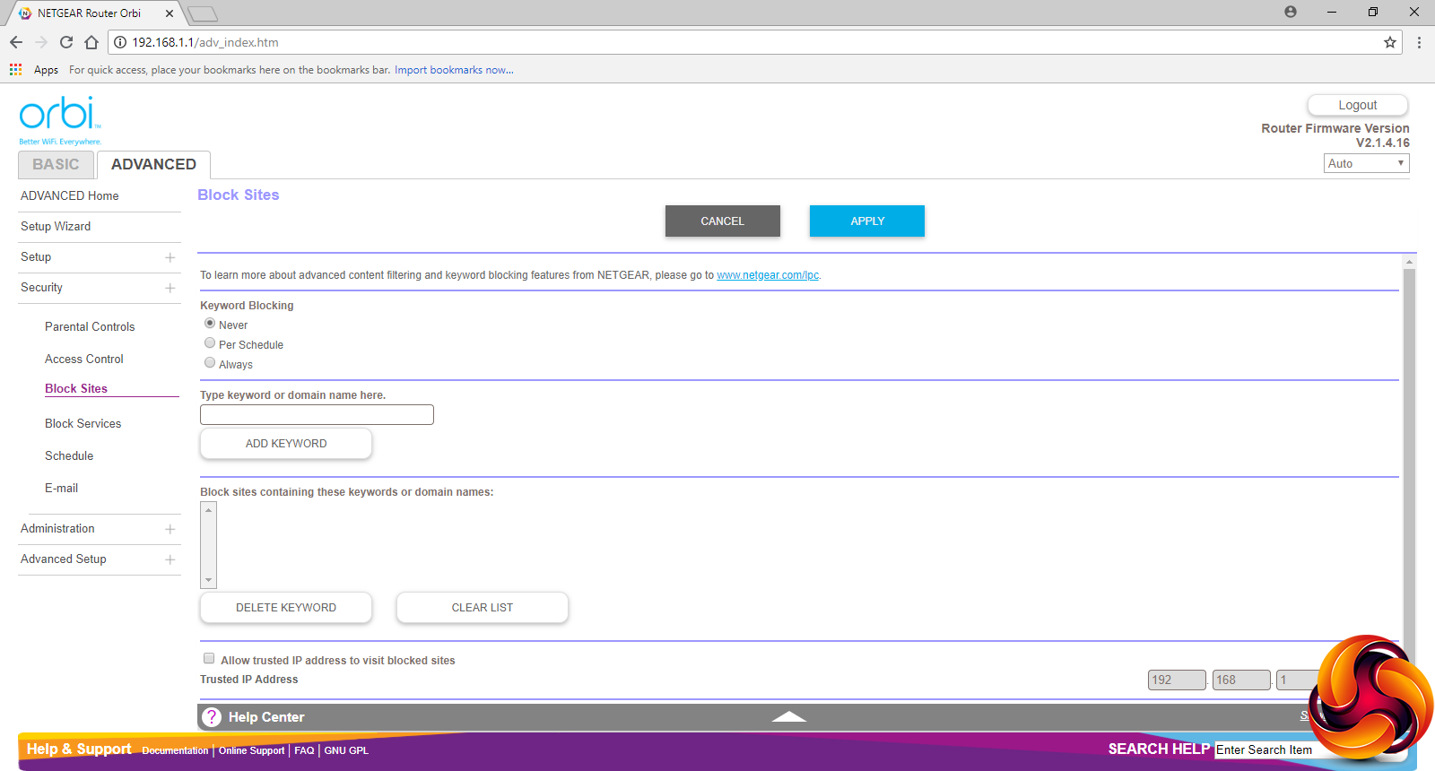 The Security section provides yet another route to Parental Controls. You can also configure access for client devices. You can block sites by keyword or domain name. Alternatively, you can block individual network services.
