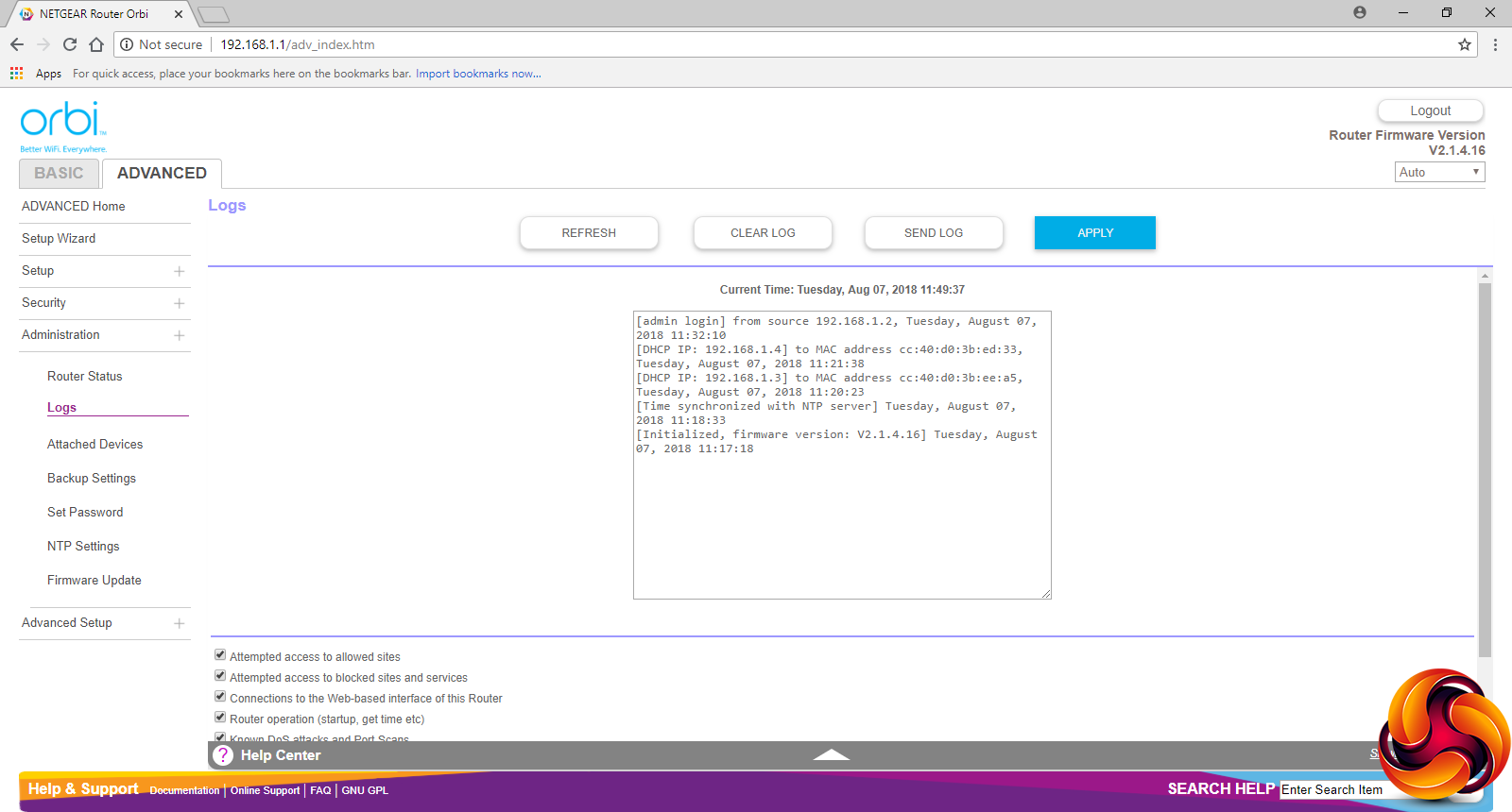 The admin section includes another route to the status screen, a log, another way to view the list of wired and wirelessly-attached devices, and the ability to back up settings.