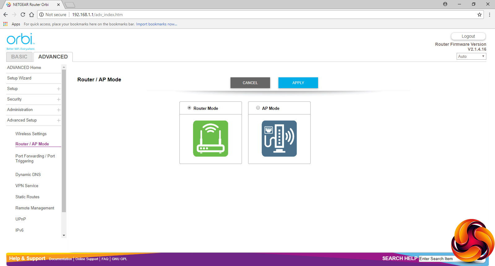 The Advanced Setup section within the Advanced tab includes more details for the WiFi signal. You can switch the router between Router and Access Point modes. The usual Port Forwarding / Port Triggering facilities are available, but the presets are very limited, including Real-Audio and Quake II/III, which are about 20 years out of date.