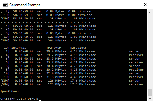 Note that the client command sends four streams of data simultaneously, simulating a multi-client connection as closely as possible with just one client. It takes 60 throughput readings at one second intervals and then averages the result.